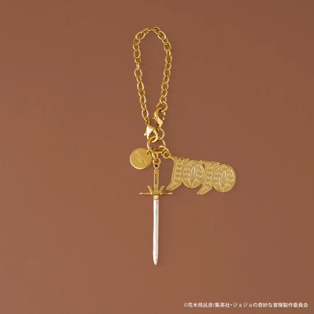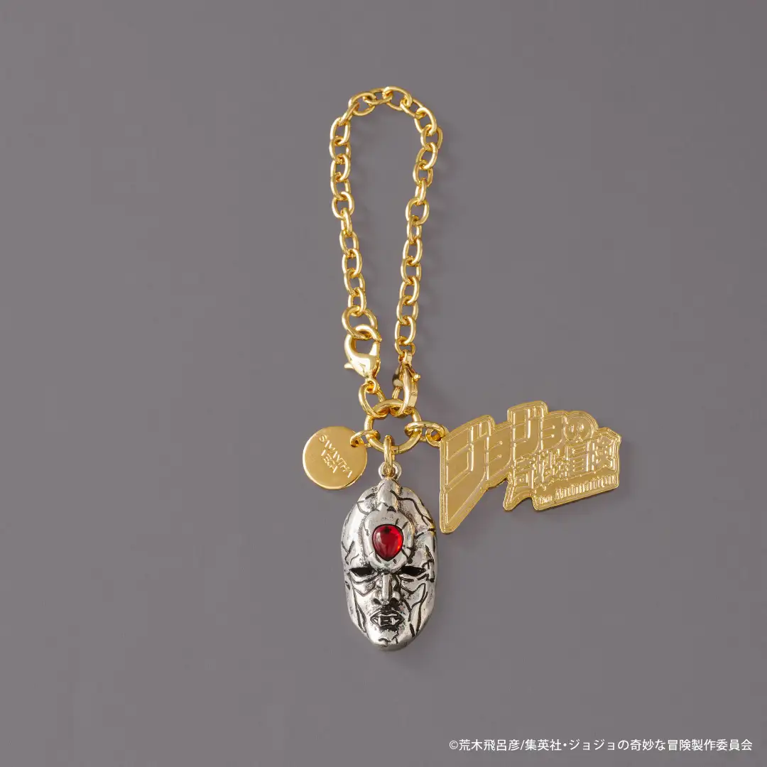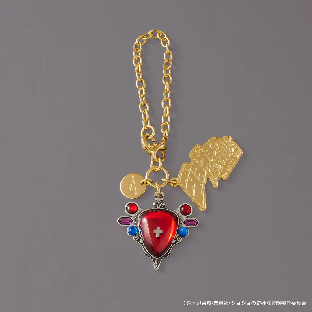 短夾背面印上迪奧的簽名,內容同樣是石鬼面燙金。吊飾則以刺在迪奧右眼、帶著波紋能量的玫瑰為主題,金色與細緻配色營造高級感。