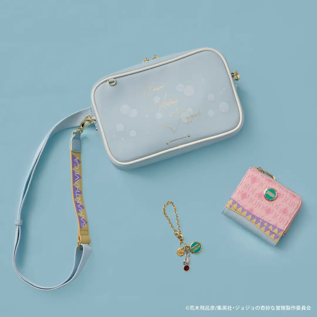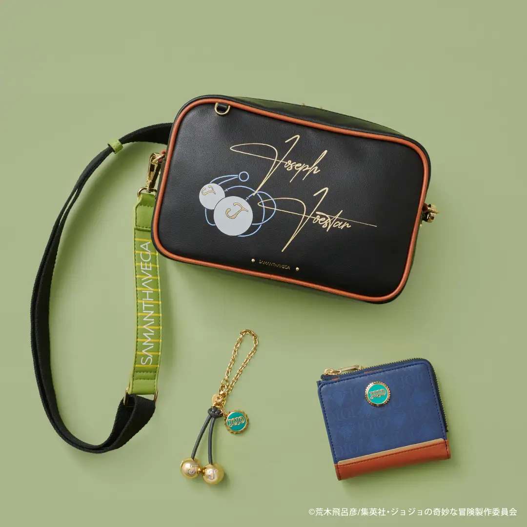 事實上 SAMANTHAVEGA 雖說是女性配件為主的系列,卻以年輕風貌的概念時常與動漫 IP 合作,這次與《JoJo的奇妙冒險》的「幻影血脈」&「戰鬥潮流」合作,推出一系列以「喬納森」、「迪奧」、「喬瑟夫」、「西撒」、「卡茲」五位角色為靈感的包款、短夾與吊飾。