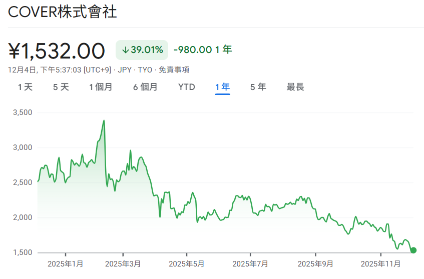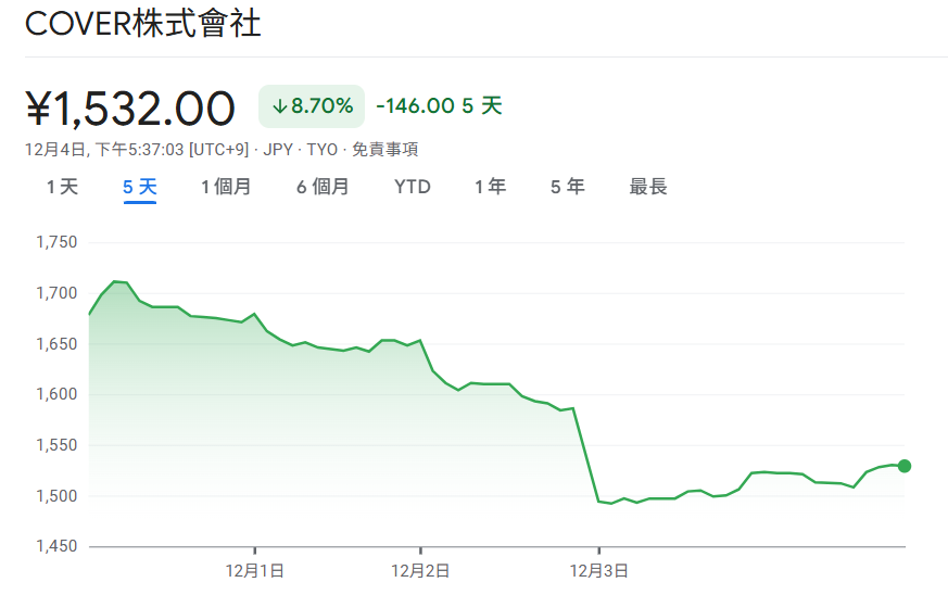 隔天Cover的股價便從前一天收盤的1,580日圓掉到1,504日圓,也讓這間公司幾乎從今年的股價高點一路下來,已經對半砍的現象,也讓不少粉絲擔憂公司營運的情況是否堪慮。