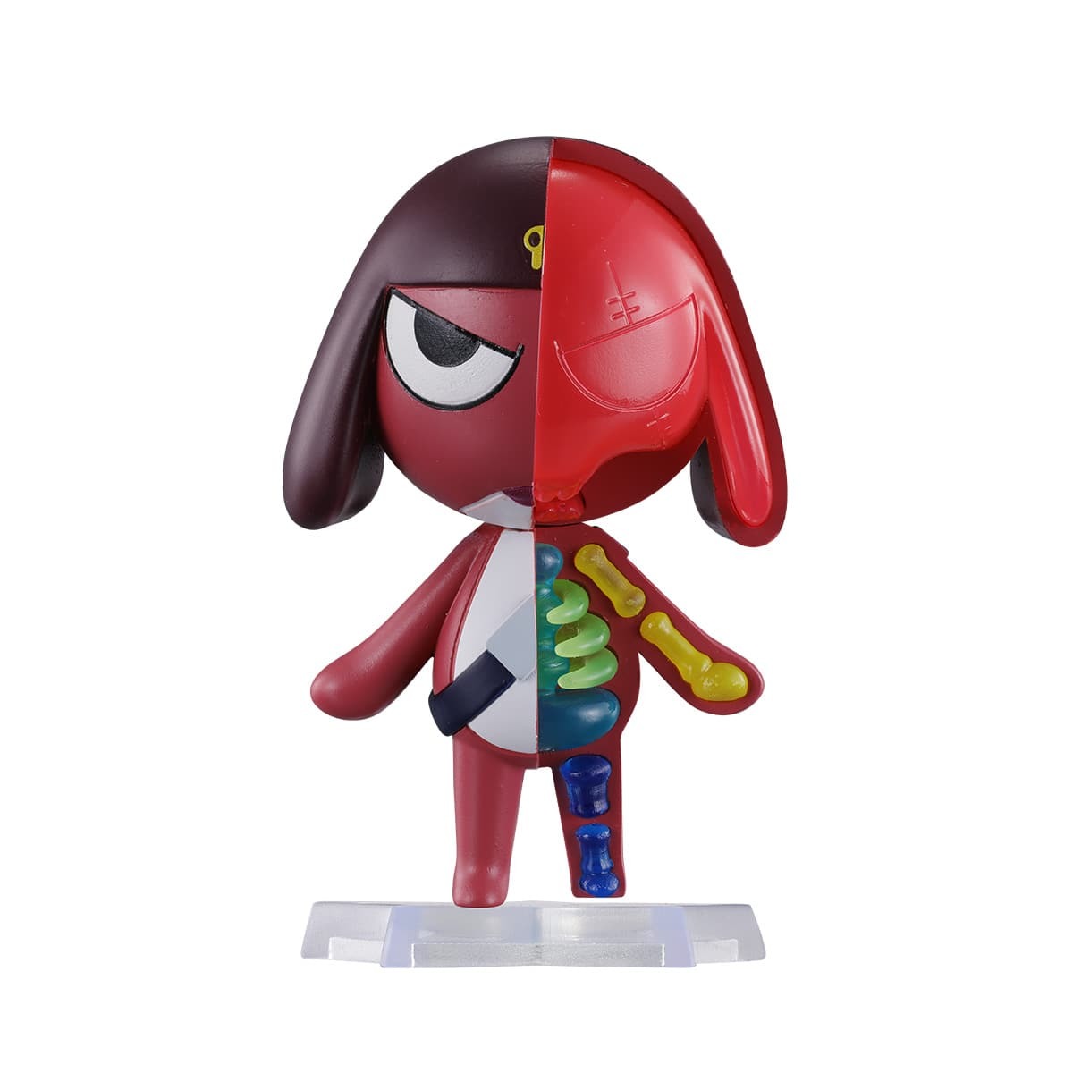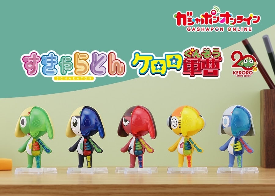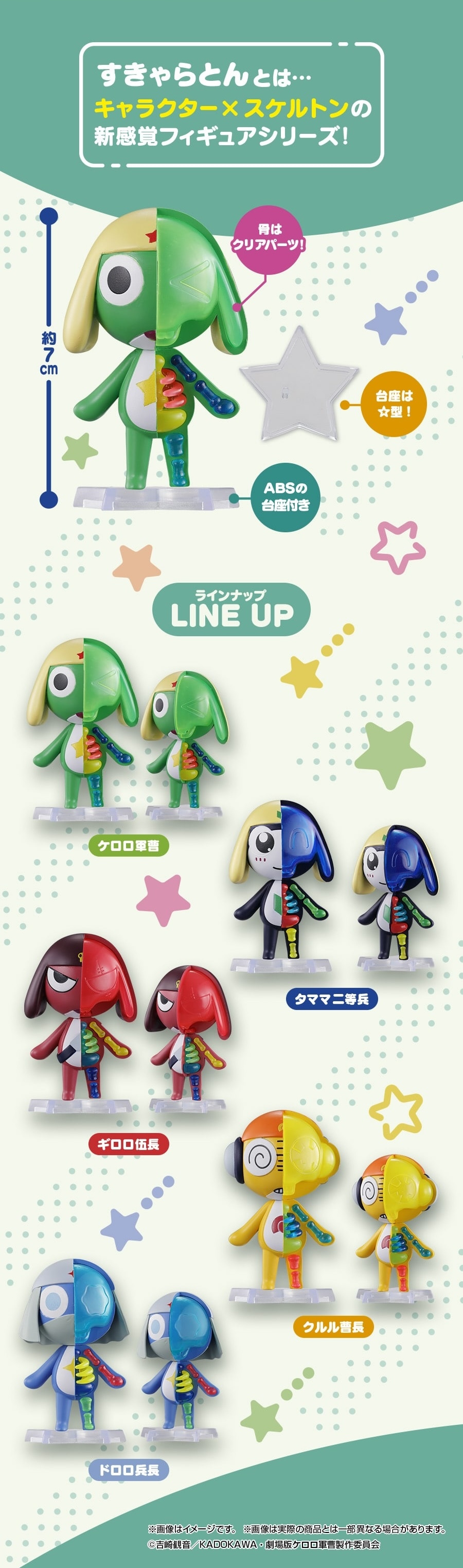 透明骨骼角色模型(すきゃらとん)是以將「スケルトン」(Skeleton,透明骨骼)與「キャラクター」(角色)結合為發想的系列。本次的「Keroro軍曹 透明骨骼角色」收錄 Keroro 小隊成員——Keroro 軍曹、Tamama 二等兵、Giroro 伍長、Kururu 曹長以及 Dororo 兵長共五種款式,在高約 7 公分的尺寸下雕刻呈現青蛙們半剖露出內部器官構造的造型,骨骼與內臟部分採用彩透材質打造,繽紛的色彩非常討喜,可以一窺 K 隆星人的身體構造真的超讚的啊!