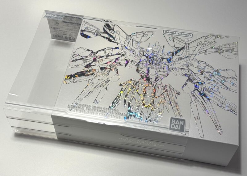 模型外盒設計也採用對應特殊色彩的新設計,採用極具質感的大白底結合雷射燙銀效果「攻擊自由鋼彈」線稿,隨光線反射角度呈現七彩光芒。萬代商標、商品名稱...等圖片字樣則是單獨印在另一層透明保護殼上,拆下後就能欣賞完整的盒繪。