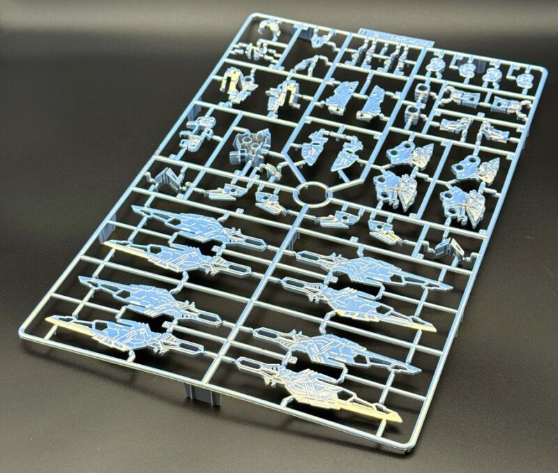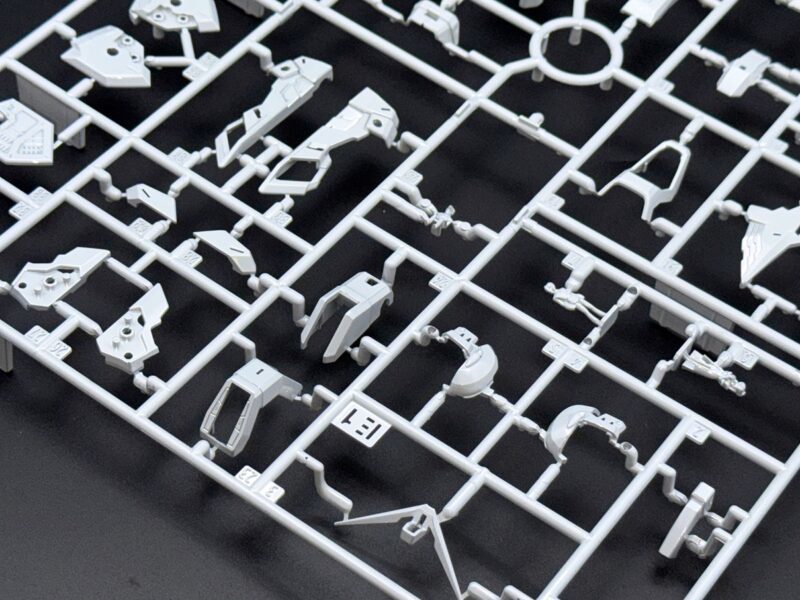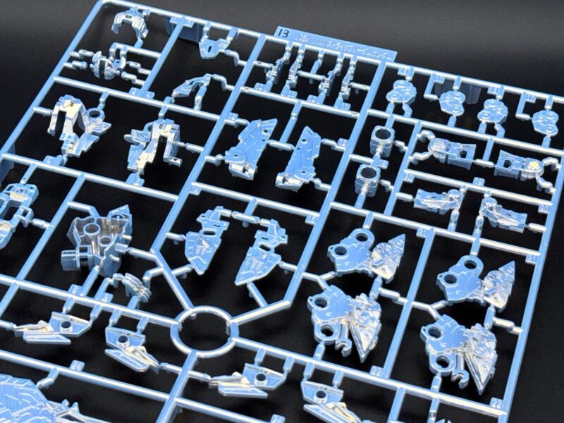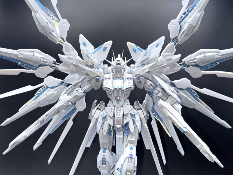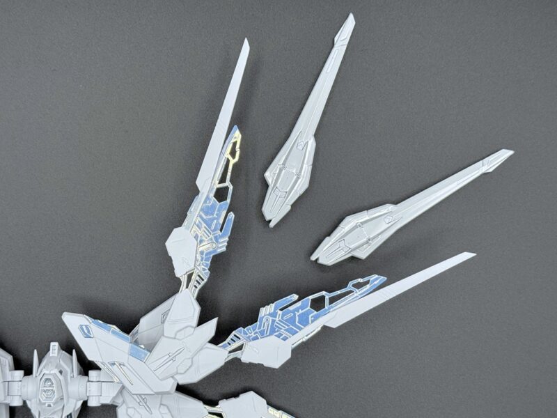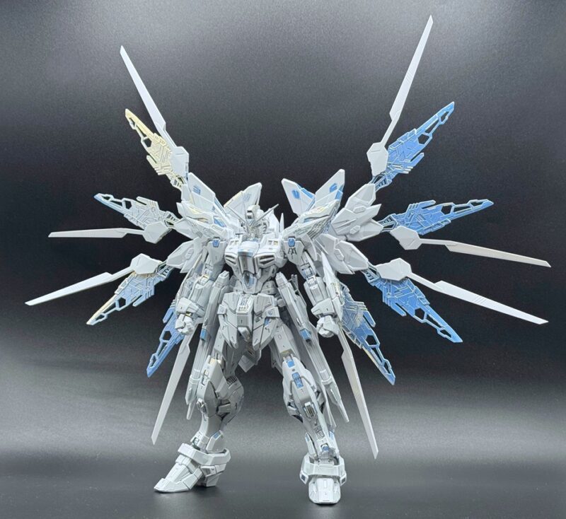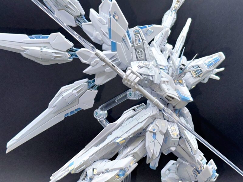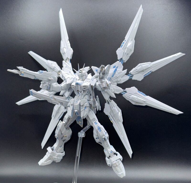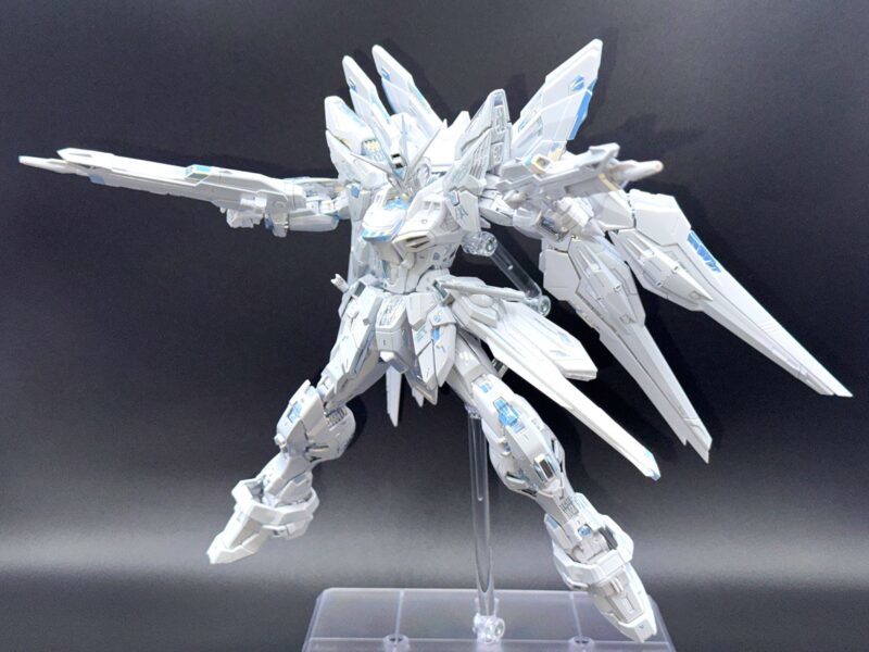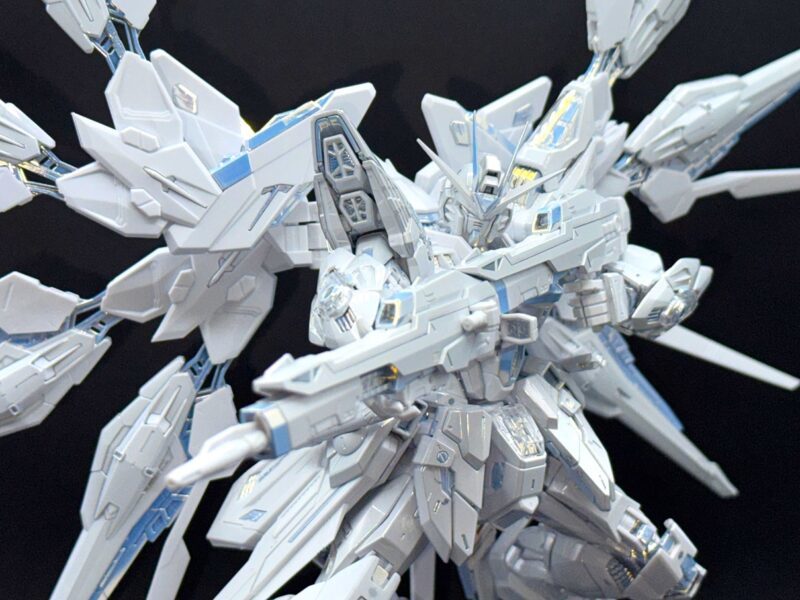 除了使用三種不同白色成形色的 PS 零件外,部分白色裝甲施以在經過銀色電鍍的零件上噴塗白漆的「TITANIUM FINISH」加工呈現雪白色調,內部骨架等多數零件更採用新技術「TWILIGHT COATING」製作,模型表面呈現電鍍質感與偏光效果,隨著觀賞角度不同能反射出金、銀、藍等色彩。