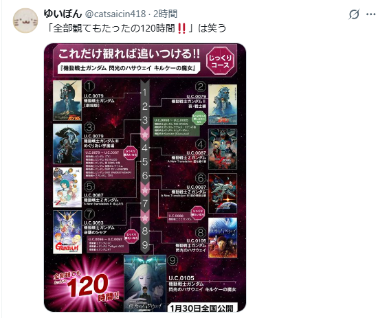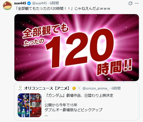 這也讓粉絲們忍不住大喊:「哪裡只要’啦 www」、「不吃不睡的話,五天看完 OK 啦(才怪)」。完全是一片吐槽聲中充滿溫暖的愛,鋼彈粉追個120小時不過分吧。