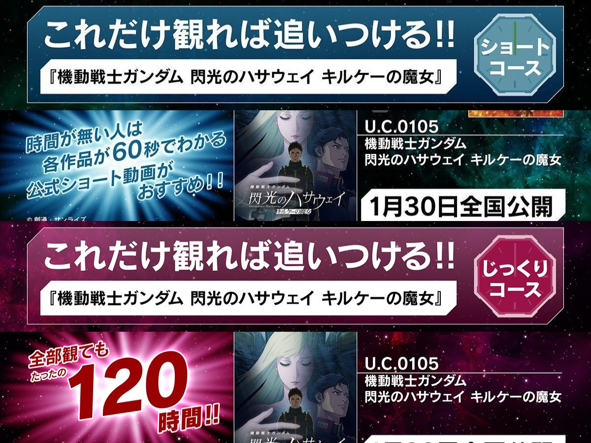 可以看到官方給出的指引路線圖,從劇場版U.C.0079機動戰士鋼彈三部劇場版,再來還有各種需要補足的U.C.0068 ~ 0085 的各部作品,甚至其中還有今年的GQuuuuuuX,這樣子總計九個區塊才會到即將上映的《機動戰士鋼彈 閃光的哈薩威 喀耳刻的魔女》,官方宣傳竟然還很自然地用上「只要」這種說法,絕對是...追鋼彈這麼苦嗎 XD。