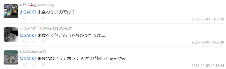 便當相關貼文發布後,留言區最常見的質疑是 GACKT 過去曾公開表示「不吃白飯」,因此許多網友質疑他是否真的能評斷飯與配菜的平衡。留言包括:「不是不吃飯的人嗎?」、「米都不吃,怎麼知道飯跟菜的搭配?」、「你有試吃米嗎?」、「是不是忘記自己不能吃飯的設定?」