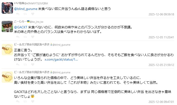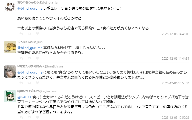 除了不吃白飯的爭議,部分美食系網友也對 GACKT 所謂的「究極便當」概念提出質疑:「便當是要能冷吃、能保存、誰都能吃的食物,高價食材塞進便當盒不是重點。」、「高級食材做出好吃料理很正常,真正厲害的是在價格限制內做出美味。」、「說現有便當都不夠厲害,卻拿高價位便當來比,不公平。」
