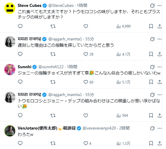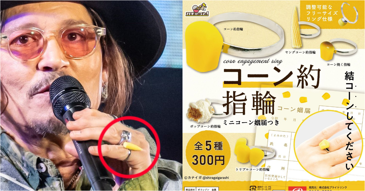 在舞台中現身的強尼·戴普保持始終時尚帶著帥氣的裝扮,卻有日本網友意外發現,他手上配戴的其中一款戒指,玉米造型看起來格外顯目,似乎跟轉蛋機販售的款式一模一樣,這個發現也成為日本社群話題。