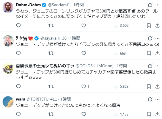 當然也不少網友想去找這台轉蛋了,只要300日圓就有機會買到強尼·戴普配戴款式,這絕對是名人少見的著用飾品 XD。