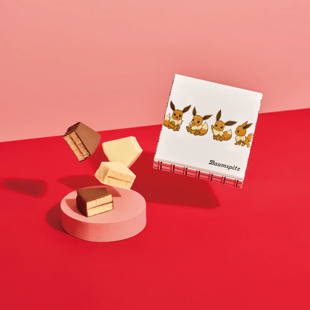 一口大小的年輪蛋糕夾上果醬,再裹上巧克力。內袋是 4 種不同姿勢的伊布(隨機)。