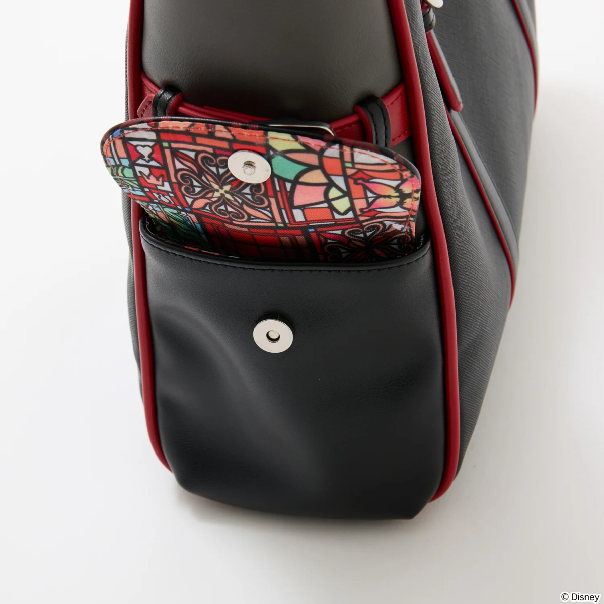 以黑色為主色,把索拉服裝的配色大膽又細緻地融進去。紅色線條、包包側邊的格紋口袋加上小皮帶設計。正面也做了王冠金屬牌,以及參考索拉服裝風格做出的鉚釘裝飾。
