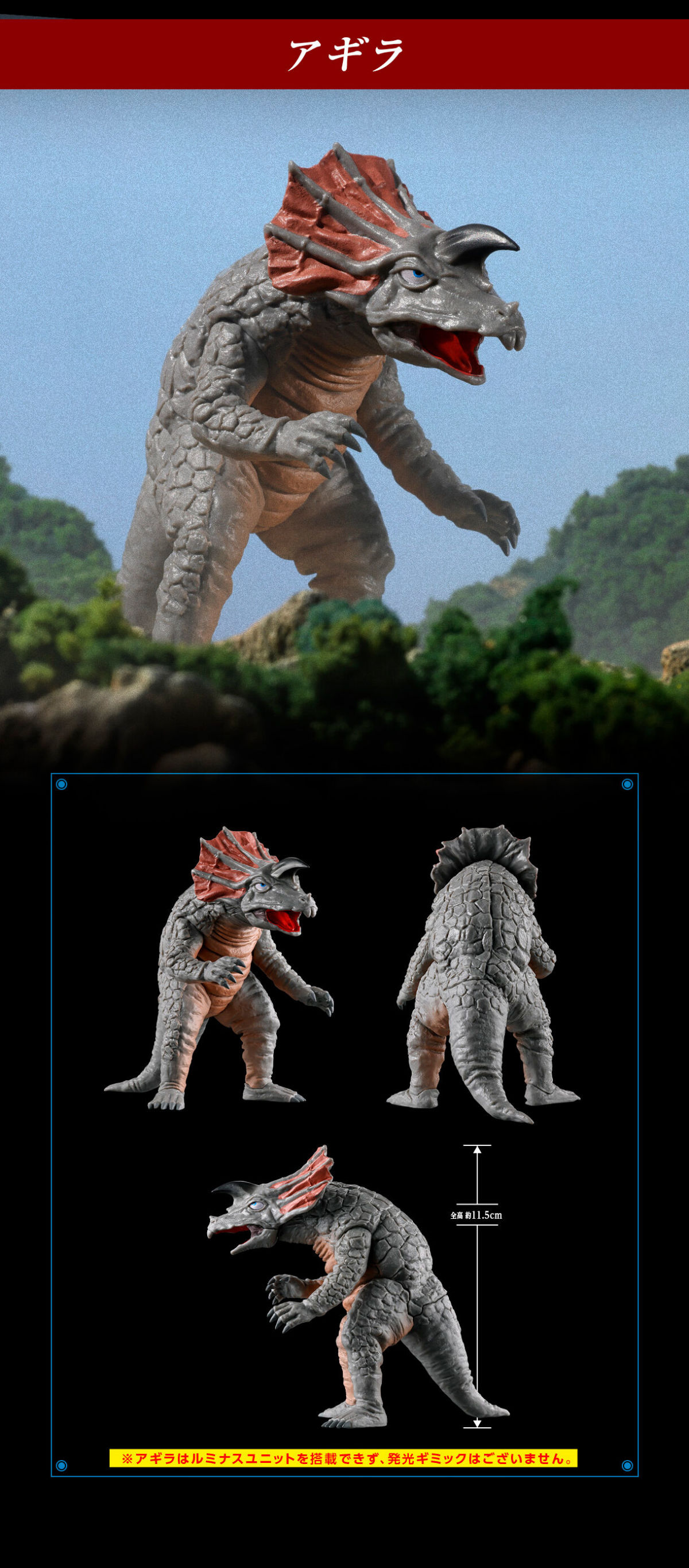而膠囊怪獸「阿基拉」則以全高約 11.5 公分尺寸製作,細膩表現他岩石般的皮膚、近似三角龍的頭部造型,往上吊的眼神看起來呆呆的有些可愛,與仿造超人七號一同展示就能再現分不清是不是主人、腦袋陷入混亂的場景。