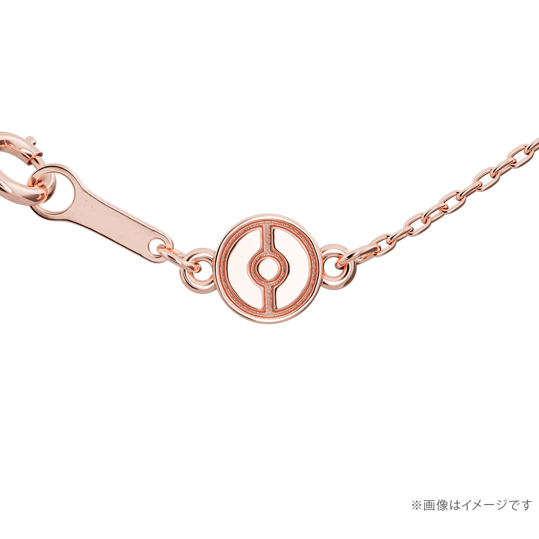銀色白蝶貝戒面上再加上玫瑰金的鍍色,已精細塑型技術呈現出仙子伊布那種療癒系的柔和能量。項鍊串上追加一個粉色鑽石作為點綴,扣具上還有精靈球的造型來呈現寶可夢元素。