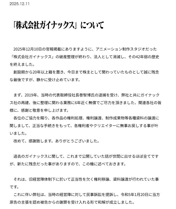 我也深深明白,他們已經不可能再回到以前那種「朋友」的關係了。這也是為什麼,雖然和解已經結束,但我不再願意為他們再花任何時間。最後,我想表達的是:那些本來應該由舊經營層扛下的責任,結果全都推給了 GAINAX 這間擁有輝煌歷史的動畫公司。就在那樣被放爛的狀況中,新團隊仍努力處理各種雜務、把散落的權利與資料重新整理好,並且盡力面對債權人。