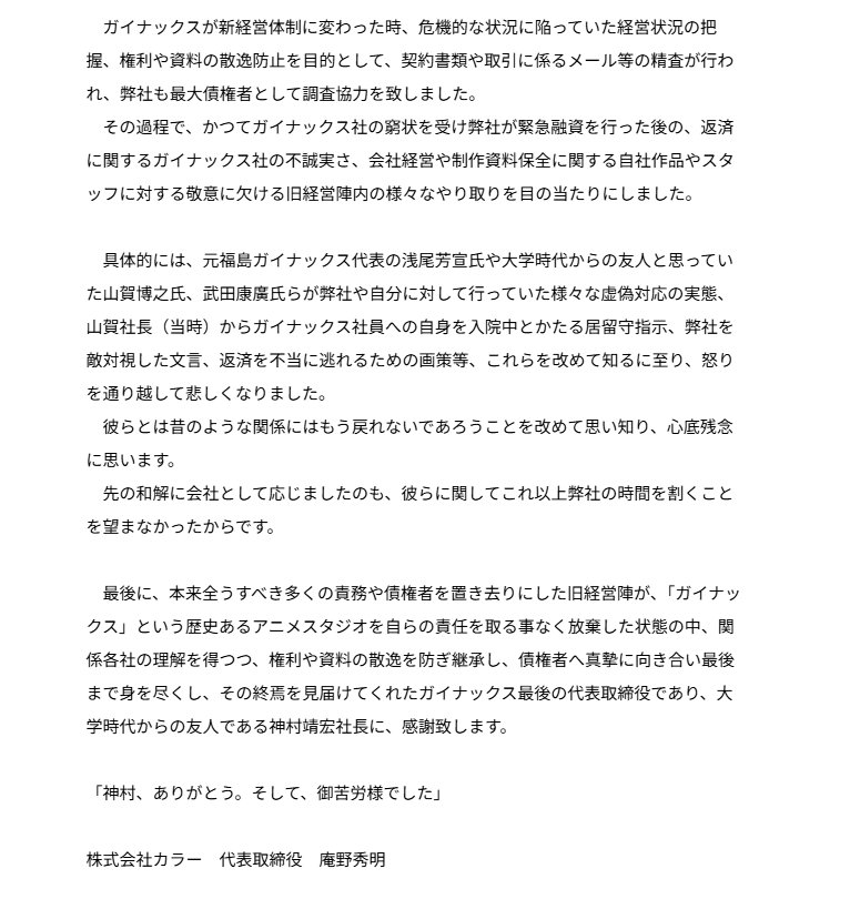具體來說,前福島 GAINAX 代表淺尾芳宣,以及大學時代就以為是朋友的山賀博之、武田康廣等人,對我們公司還有我本人做出各式各樣的虛偽應對;也曾指示 GAINAX 員工假裝他本人住院不在,藉此逃避我們的聯繫;甚至寫下敵意滿滿的內容,還有一些明顯是為了規避還款義務的手段。當這些事一件件浮上檯面時,我原本的憤怒甚至都變成了悲哀。