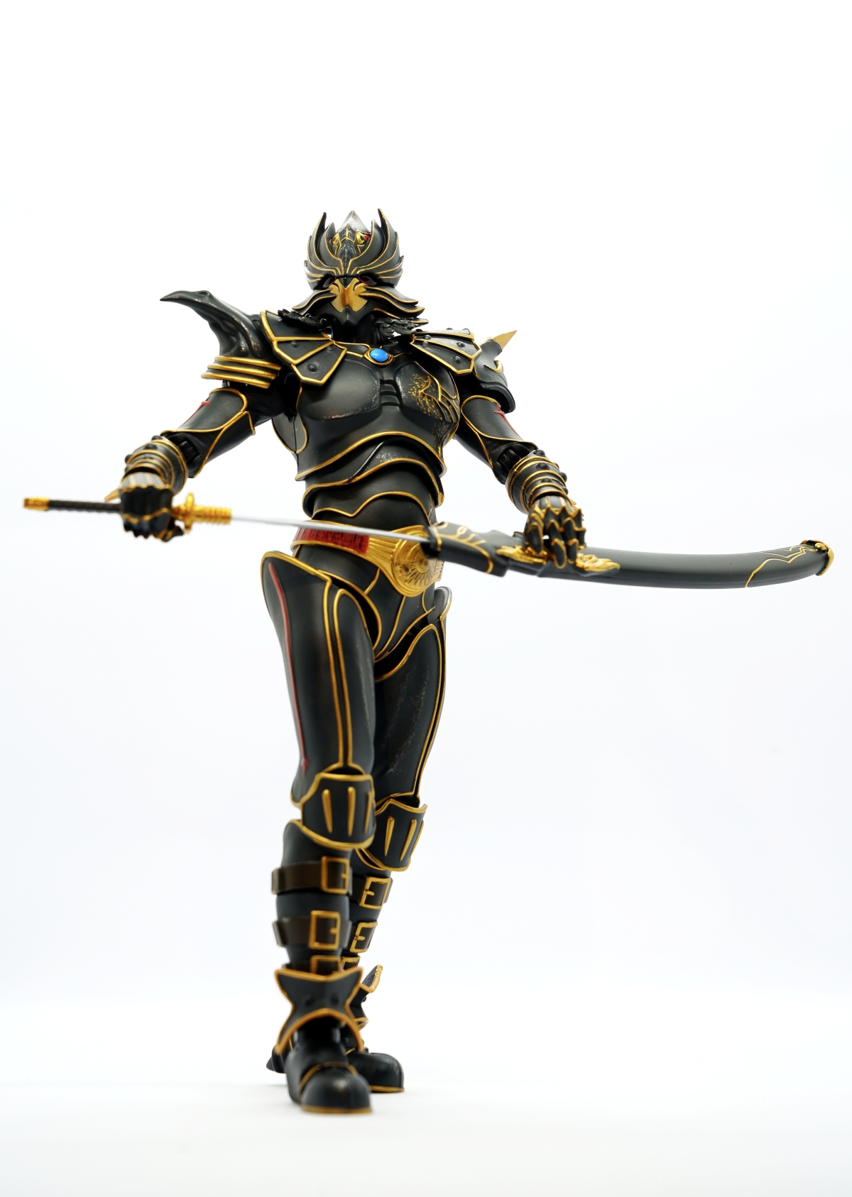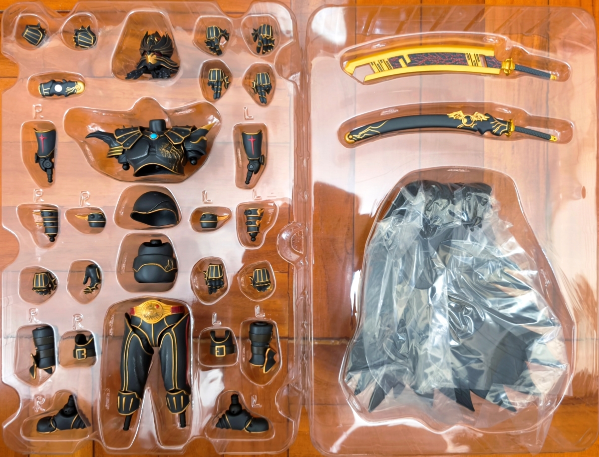 主體高約 20cm,配件包括專屬披風、專屬刀、專屬刀解放形態、專屬刀鞘、替換手型*4對、專屬造型披風等。眼部可以磁控發光!