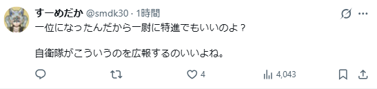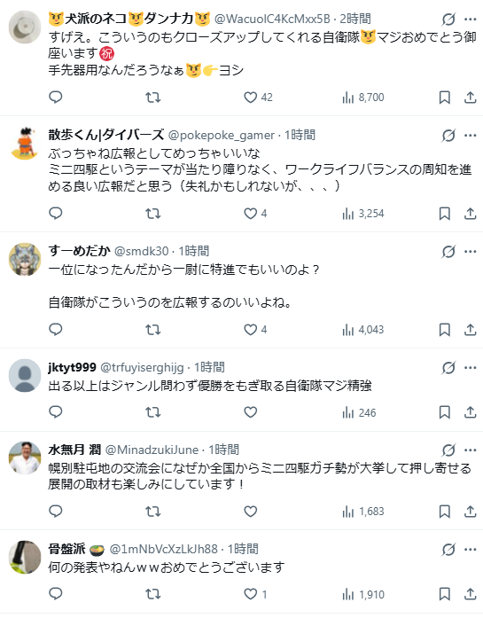 不少日本網友也驚呼,沒想到保衛國家的職業之下,居然軍官還可以有這樣的嗜好且拿下冠軍代表日本出國比賽,真的太出色了。也有網友表示,第一次看到自衛隊表揚是用這種方式的 XD。