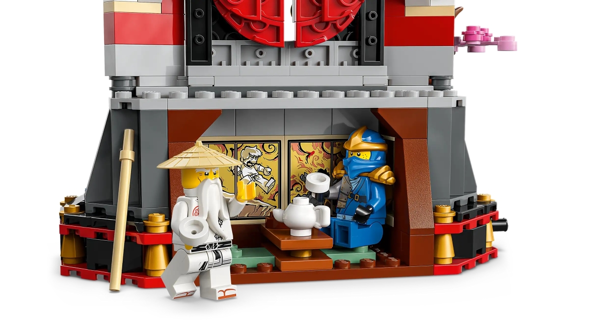 本作一共有 447 片零件,以寺廟大門為題設計的場景組完之後高約 19 公分,正面展現出石造階梯、石燈籠、櫻花樹跟圓弧型的大門,轉到背面則可以發現茶室裡頭有吳大師跟伽瑪當在試播集(Pilot Season)中的戰鬥場面貼紙。接著來看看最重要的人偶陣容吧!包含赤地(Kai)、冰忍(Zane)、阿剛(Cole)、阿光(Jay)、勞埃德(Lloyd)、吳大師(Wu)、武士 X(Samurai X),以及配置了 15 週年紀念底座、首度登場的雷元素大師(Master of Lightning)。全部放在底座上展示、展現極具躍動感的魄力場面吧!