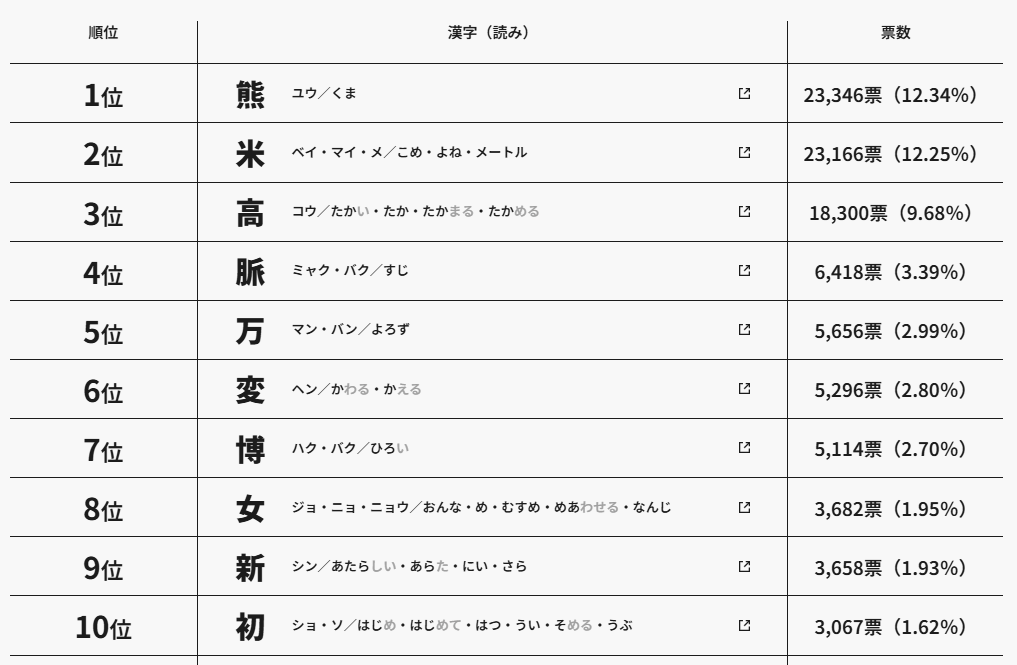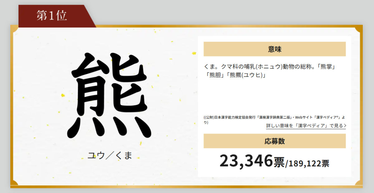 日本每年12月12日「漢字之日」都會公布,向民眾公開募集最能代表這一年的漢字「今年的漢字」。然而今年的代表字冠軍就是「熊」,照慣例由京都清水寺的住持貫主森清範揮毫寫下,同時公布了前20名,這樣的結果也當然成為話題。