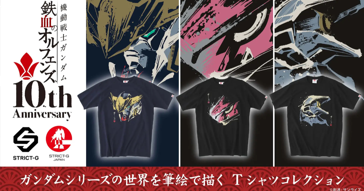 近日宣布推出以今年動畫播出10周年的《機動戰士鋼彈 鐵血孤兒》為主題的和風繪圖短 T ,以三架機體款式設計,目前可於日本萬代 PB 網站預購。