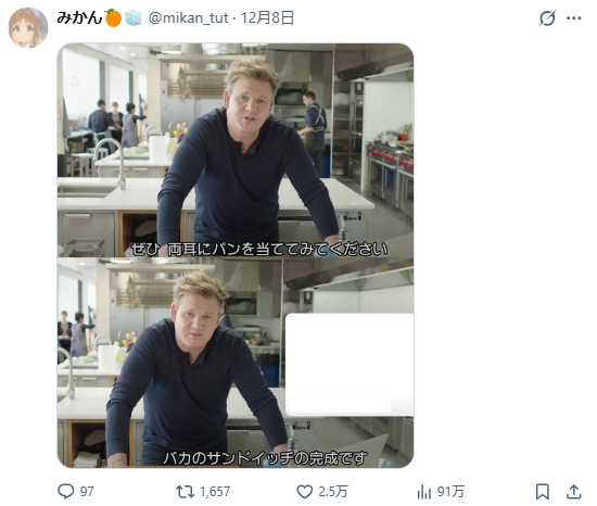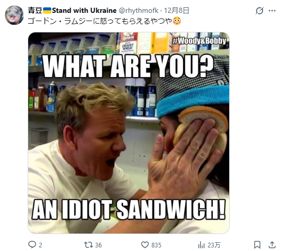這個「吐司耳罩」一貼出來,立刻累積超過 8 萬個讚,討論直接炸開。留言區也有不少人秒聯想到某個超有名的網路迷因——就是英國名廚高登・拉姆齊(Gordon Ramsay)那句經典名言:「完美的笨蛋三明治完成了。」