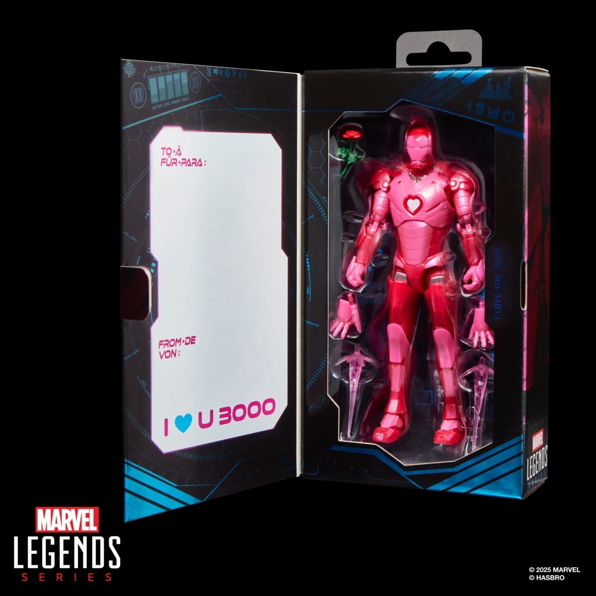 鋼鐵動力服本體以成型的紅色及帶有亮粉的粉色呈現,胸口的反應爐則改造為愛心的形狀,造型相當搶眼!配件部分收錄有一組替換手、印有愛心圖樣的推進火焰特效件以及一朵玫瑰,可以讓鋼鐵人拿著表達愛意!此外這次的外盒也以漂亮的金屬色澤印刷呈現,並做有開蓋的開窗展示設計,無需拆盒就能完美展示!