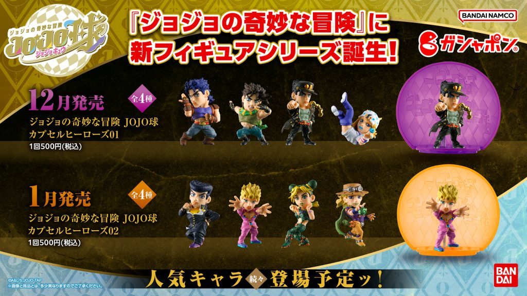 日本萬代轉蛋事業部 GASHAPON 發表了《JOJO的奇妙冒險》主題的最新「JOJO球」系列,推出首彈「JOJO的奇妙冒險 JOJO球 CAPSULE HERO 01」轉蛋!一共有四種款式,參考售價為一轉 500 日圓,預計將於 2025 年 12 月開轉。
