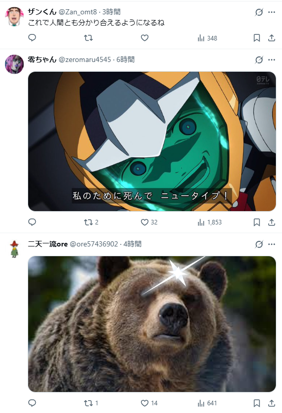 不過在日本社群,「新型態」熊(ニュータイプのクマ)一詞出現,馬上吸引許多鋼彈粉絲關注,畢竟所謂ニュータイプ / Newtype 指的就是新人類,開始各種趣味討論,原來現實中還沒出現的「新人類」,熊已經覺醒進化了 XD。