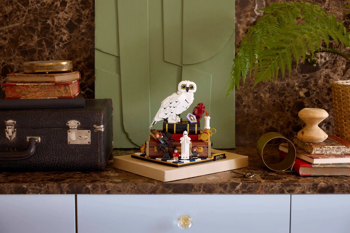 本作一共有 1571 片零件,組完之後全高來到 24 公分,整體的結構與呈現方式會讓人聯想到之前我們也玩過的「76391 霍格華茲象徵 - 典藏版」,不過這款樂高更把重點聚焦在《哈利波特:神秘的魔法石》。包含收起翅膀的嘿美(Hedwig)磚拼模型、搶眼的魔法石、加隆金幣、巫師棋棋盤、大型的磚拼棋子,以及小編個人超愛、印有阿不思·鄧不利多的巧克力蛙畫片(著名巫師畫片)。