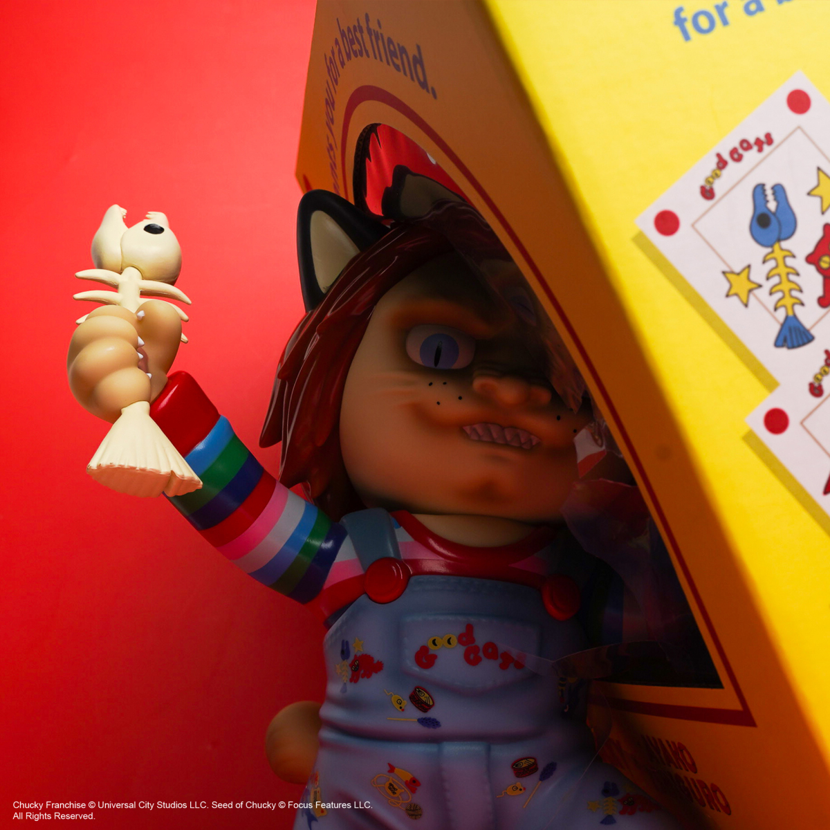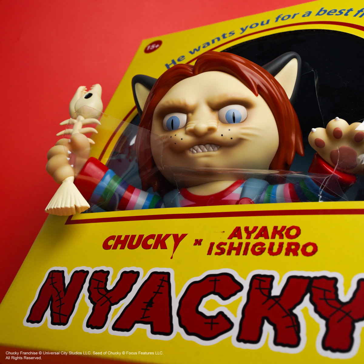 本次作品獲得 環球影業正式授權,由知名妖怪繪師 石黑亜矢子 以其獨樹一幟的貓妖風格,重新詮釋一代玩具殺人狂「恰吉」,化身為「喵吉(NYACKY)」。恰吉猙獰的表情被巧妙轉化為貓咪咬牙切齒的神態,高舉的菜刀也改以「魚骨」取代;而原本「Good Guy」吊帶褲上的圖樣,則偷渡了多處石黑老師重新繪製的圖樣。