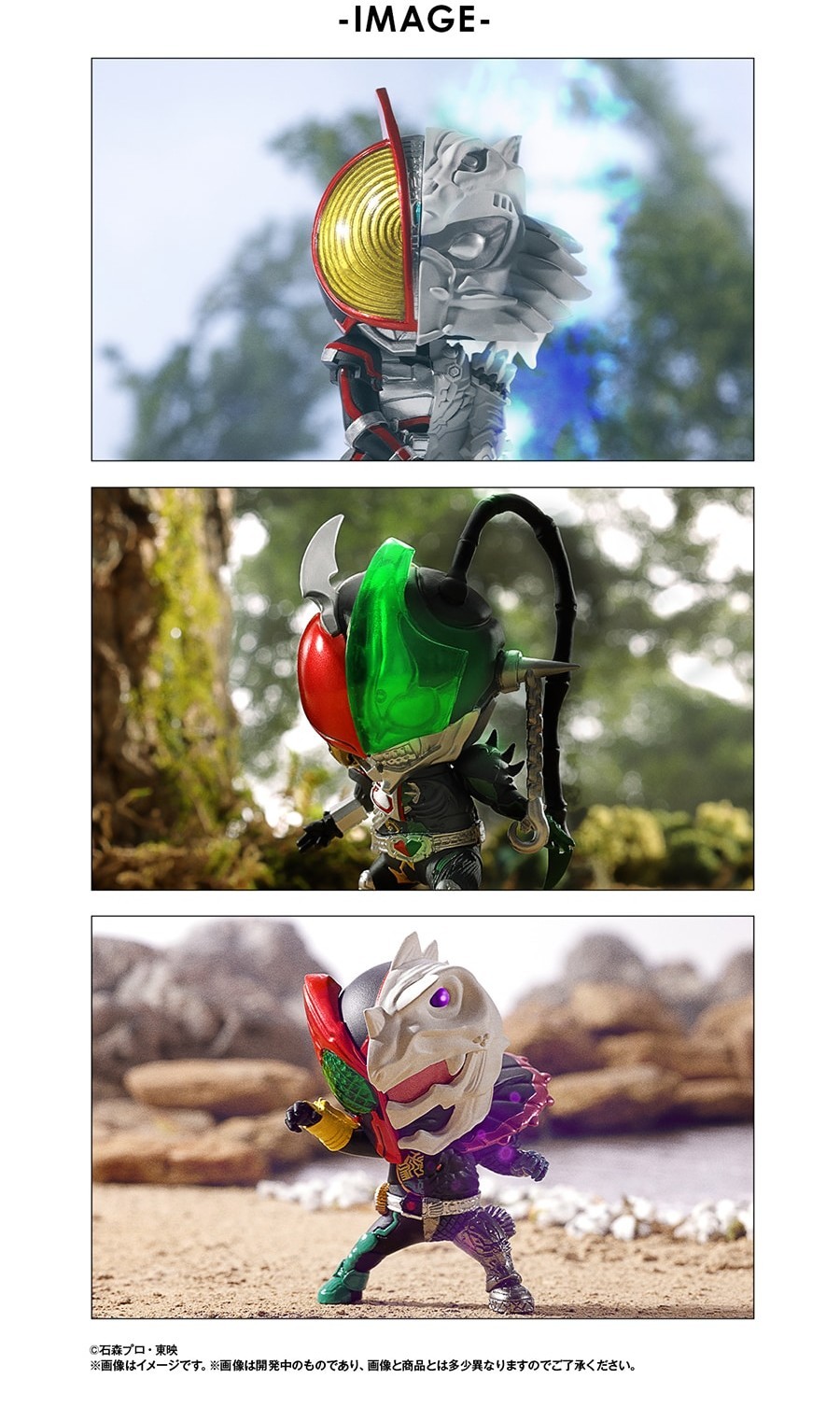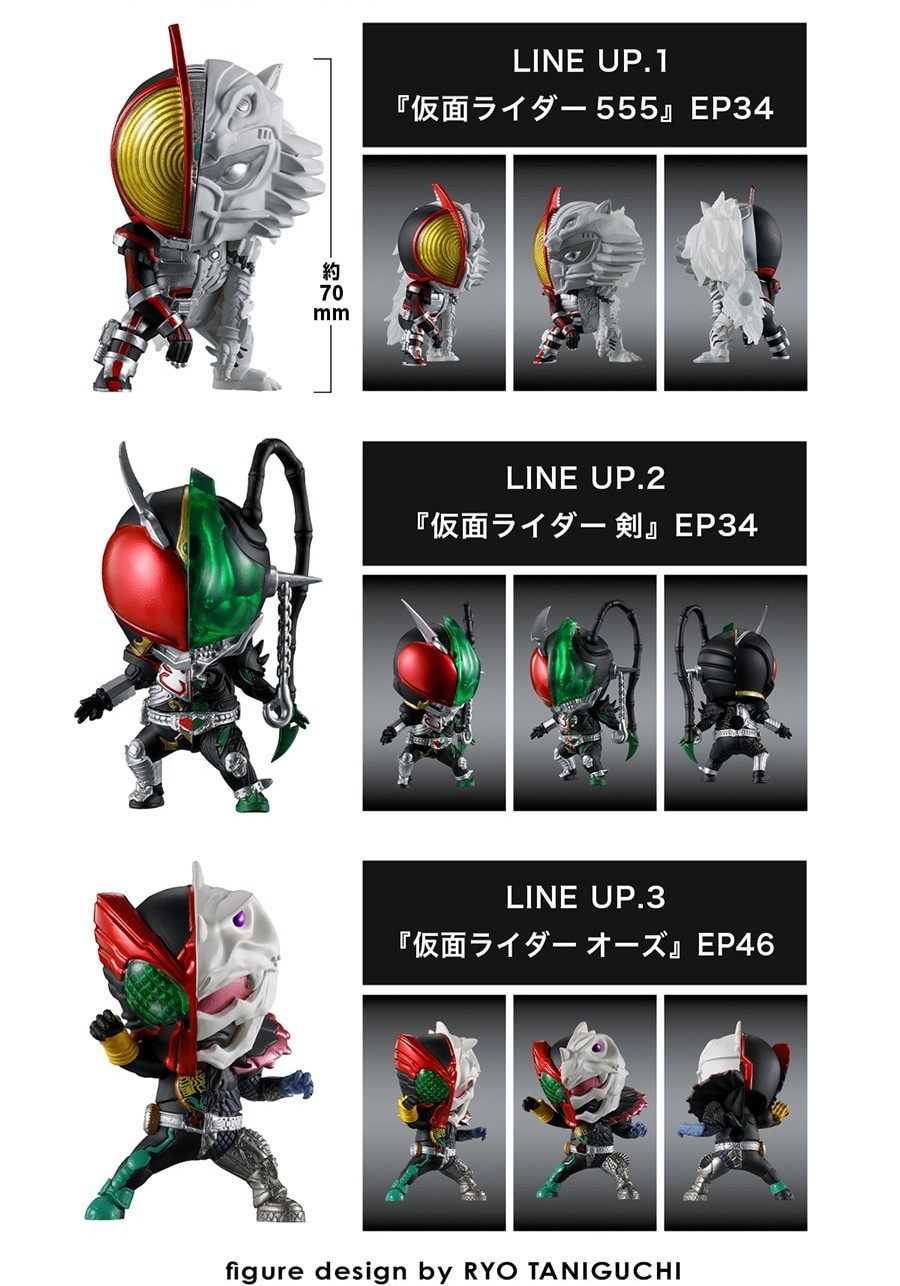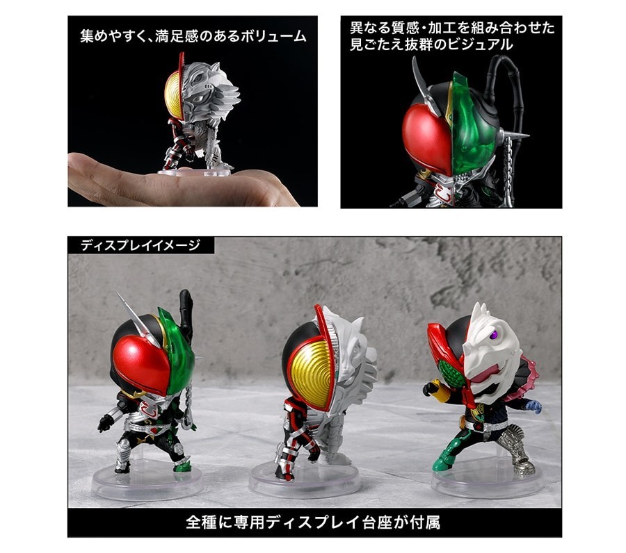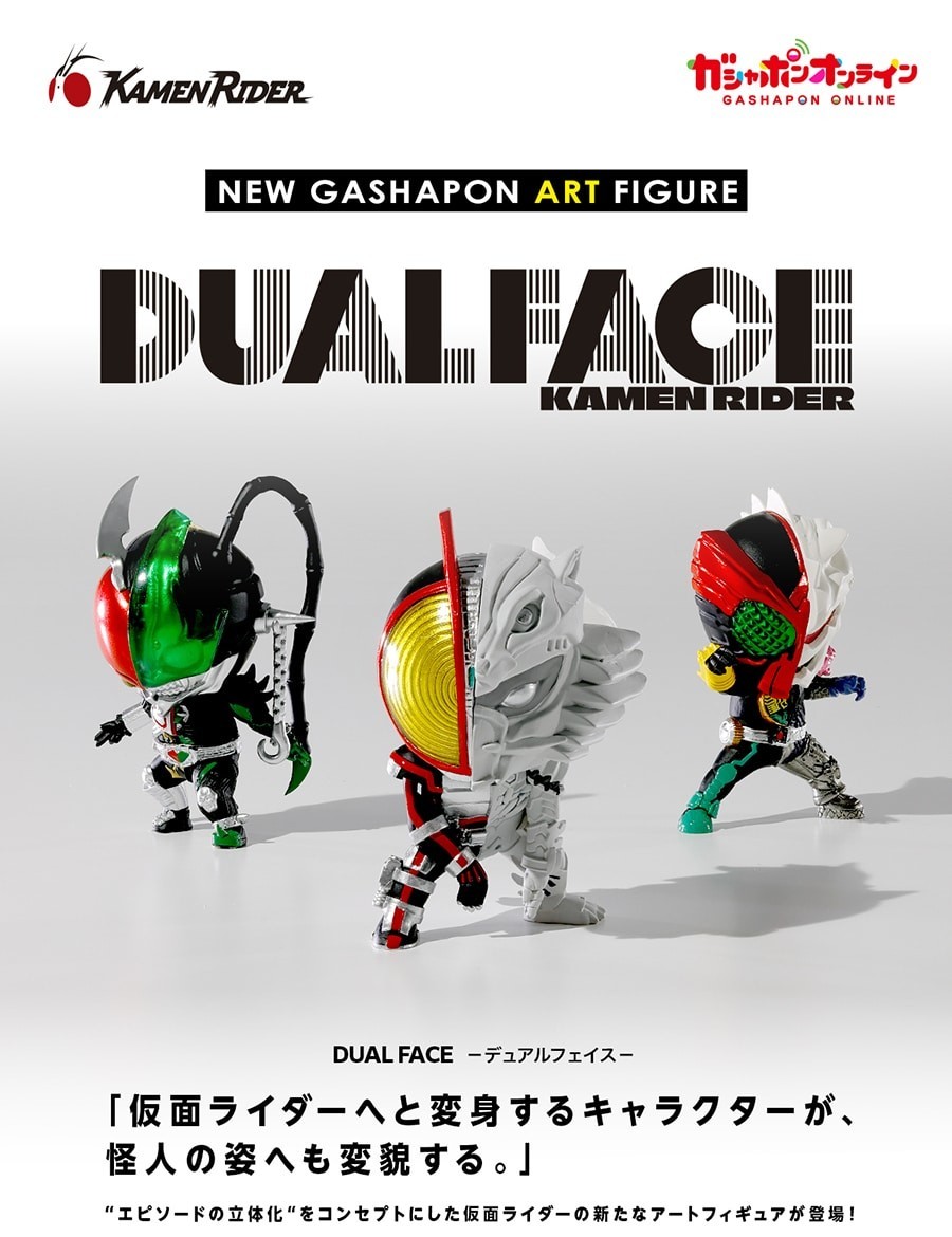 全新高品質藝術系列「DUAL FACE」,以「變身假面騎士的同時,也能變身成怪人」為主題,聚焦於令觀眾驚喜連連的劇情重大轉折點、精彩片段,並以藝術視角重新詮釋,將其轉化為栩栩如生的轉蛋模型~「DUAL FACE KAMEN RIDER」轉蛋由設計師谷口亮操刀設計,標誌性的Q版造型被濃縮成約7公分高的小尺寸中,收錄有:「假面騎士555 EP34」、「假面騎士劍 EP34」、「假面騎士OOO EP46」,透明材質與金屬塗裝的完美結合;融合了硬朗風格與流行元素,打造出令人驚豔的視覺效果!
