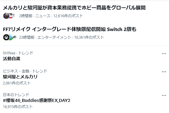 ▼ Mercari與駿河屋也瞬間成為X上的趨勢熱搜話題。