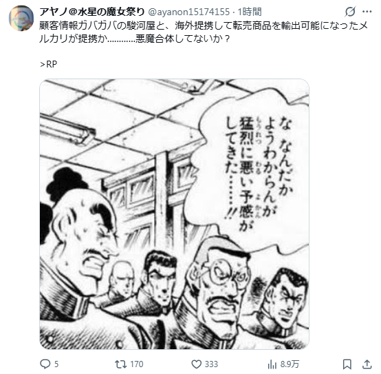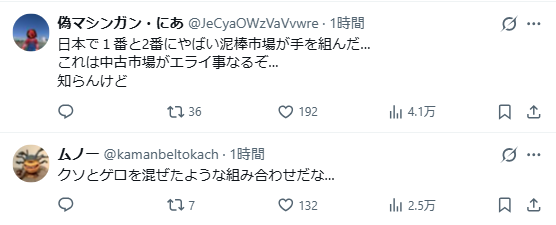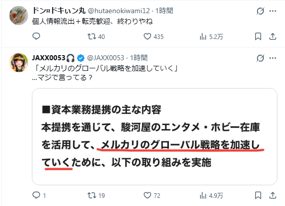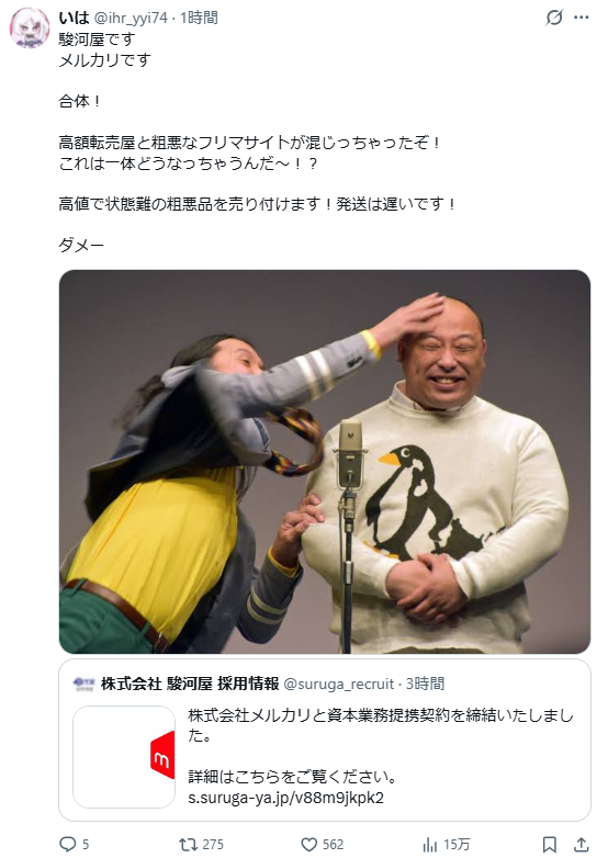 讓所有駿河屋所販售的商品,都可以在Mercari上找到,且駿河屋提供購物消費保障,提高消費者購買的信任度這消息公布也立即成為X上網友的討論話題。