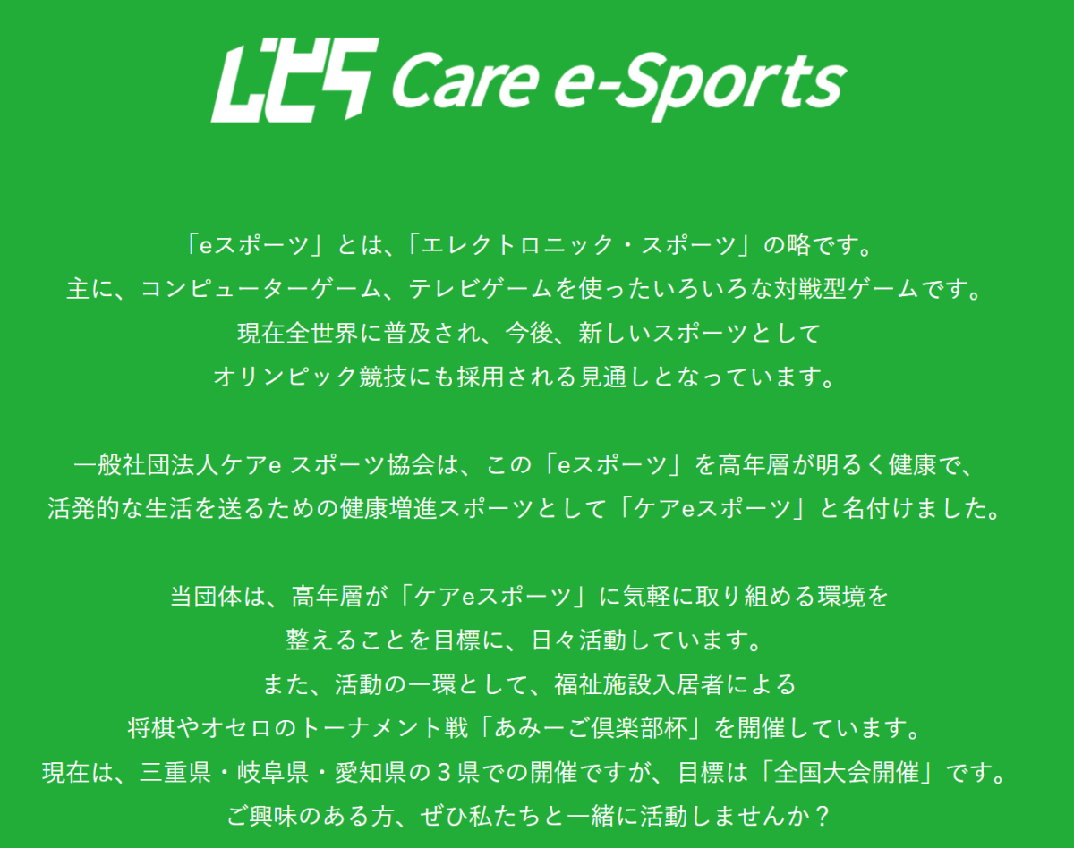講到「電競」產業,或許大家都認為是年輕人的領域,不過日本近年有個一般社團法人「Care e-運動協會」( ケア eスポーツ協会 ),舉辦了以高年齡層為參加者的電競賽事。