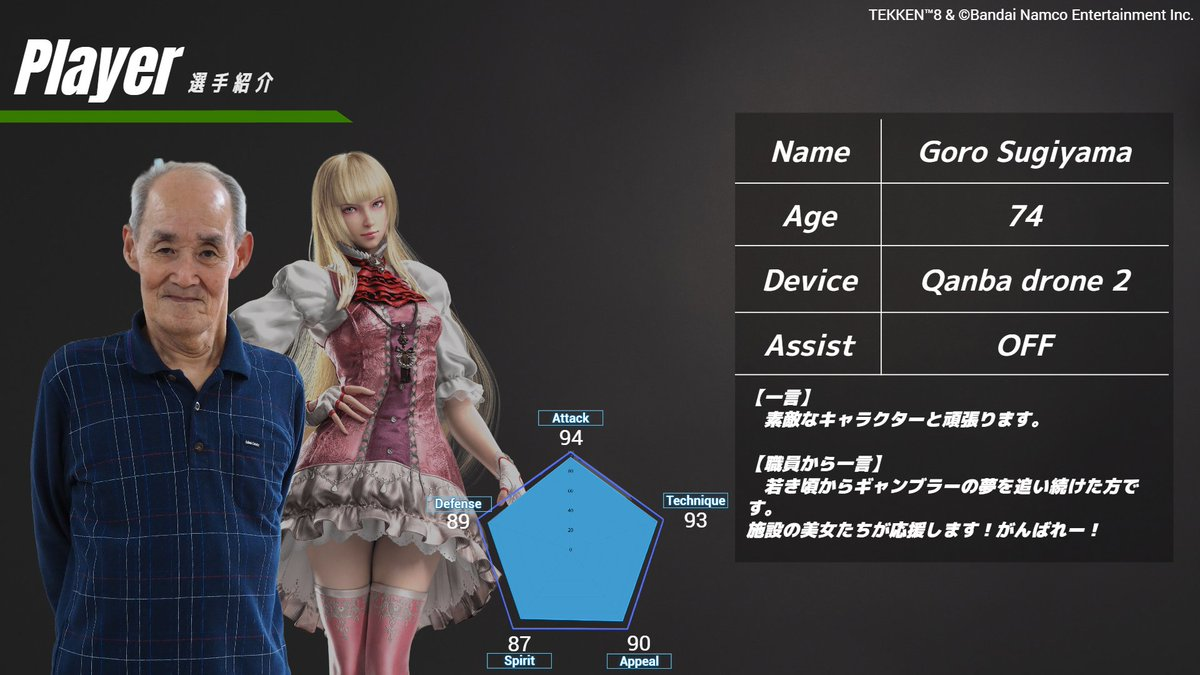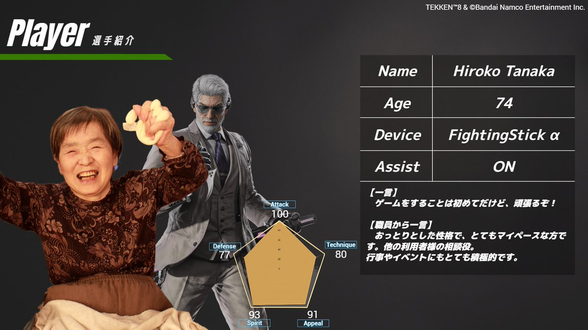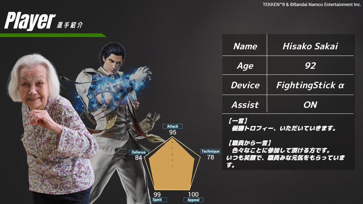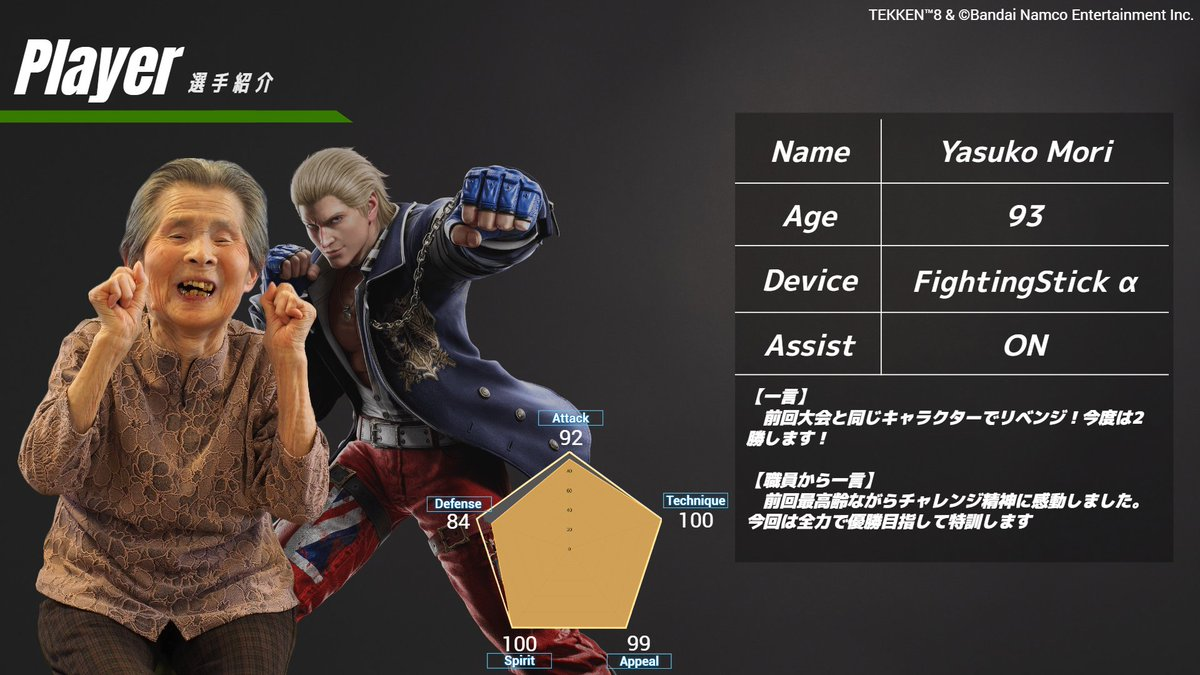 雖然第12屆賽事僅有八名選手出戰,但從官方介紹的參賽者來看,從73歲到95歲都有,每個都有自己的《鐵拳8》練角,還有戰力分析XD。真的是沒有分年齡的,很難想像這些年紀的人有些甚至住在養護機構,居然可以投入在遊戲中。