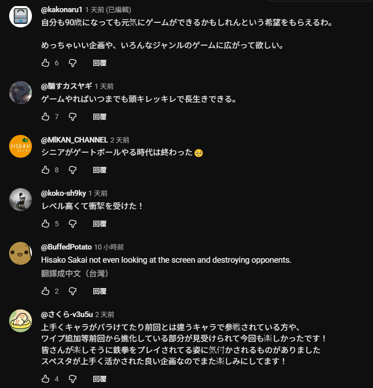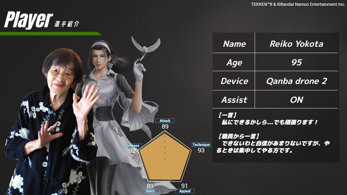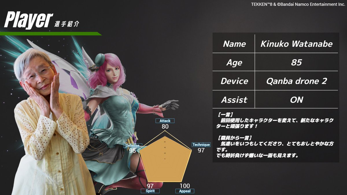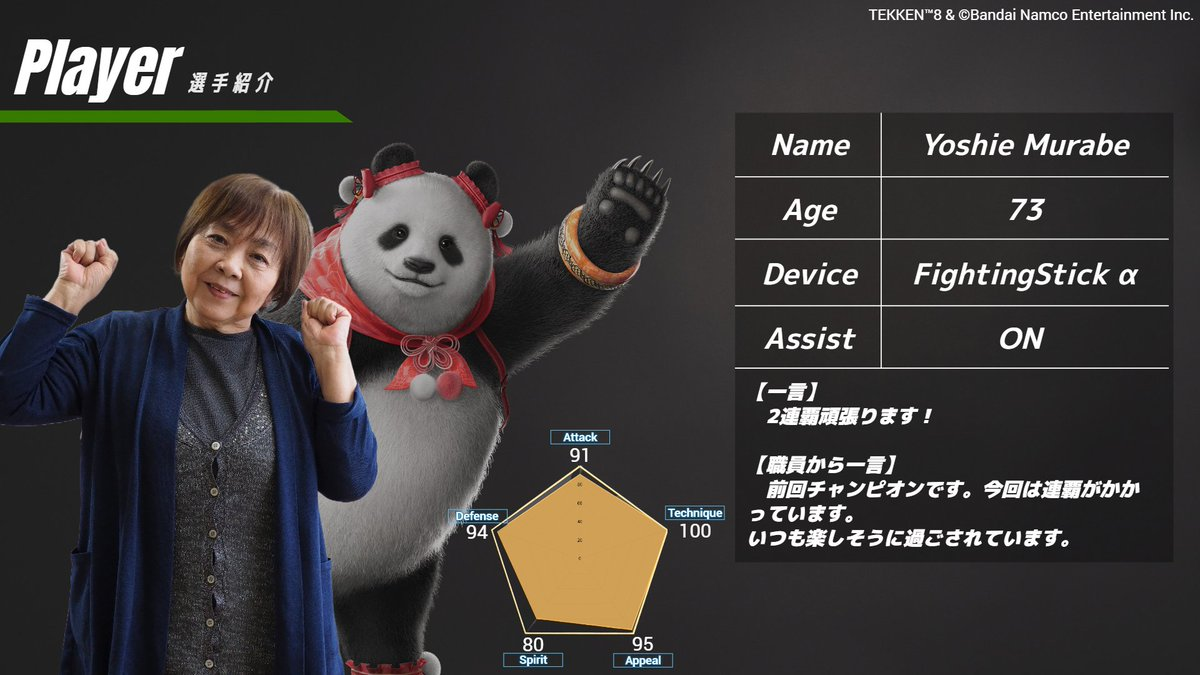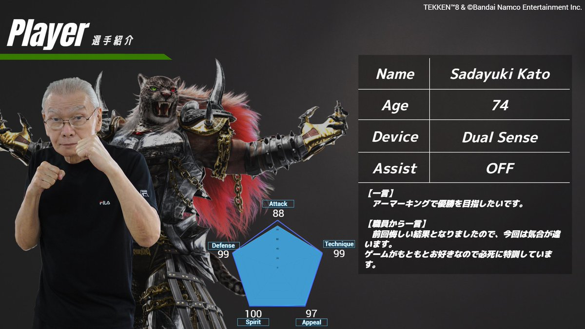 雖然第12屆賽事僅有八名選手出戰,但從官方介紹的參賽者來看,從73歲到95歲都有,每個都有自己的《鐵拳8》練角,還有戰力分析XD。真的是沒有分年齡的,很難想像這些年紀的人有些甚至住在養護機構,居然可以投入在遊戲中。