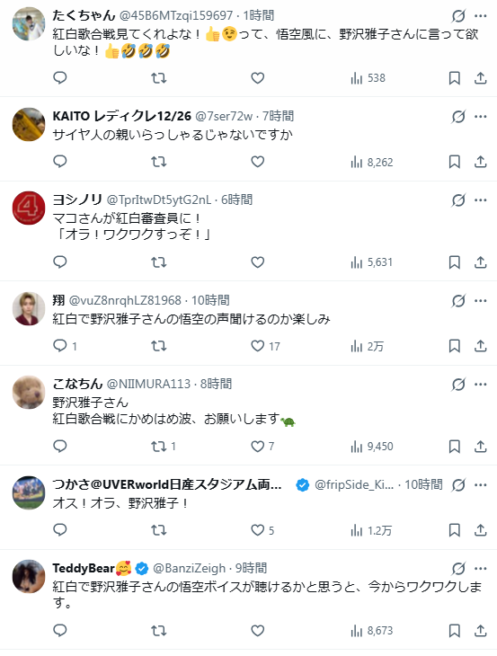 這次的評審人選也獲得網民高評價,能找到這些人一起在紅白一起共襄盛舉所屬不易。尤其是野澤雅子這位對許多人來說是國寶級的聲優大神,很多人期待她在紅白與藝人的互動。