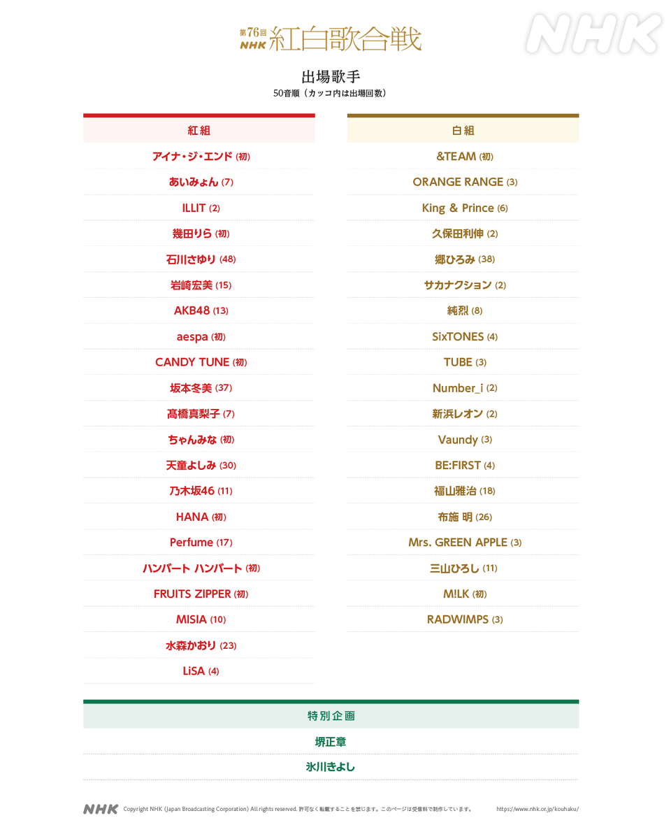 ▼ 「第76屆NHK紅白歌唱大賽」出場名單