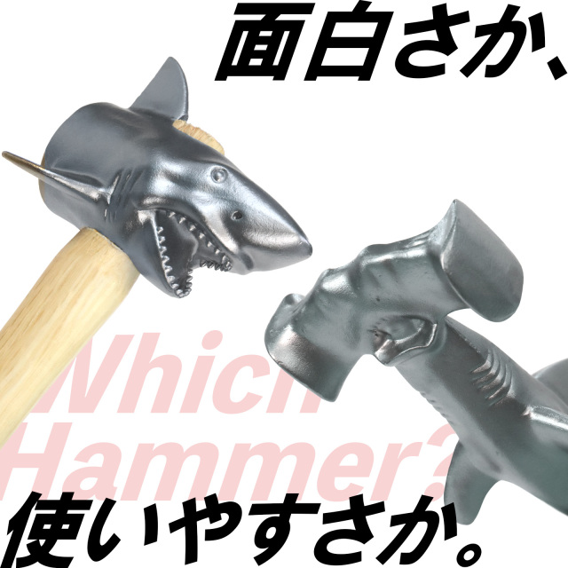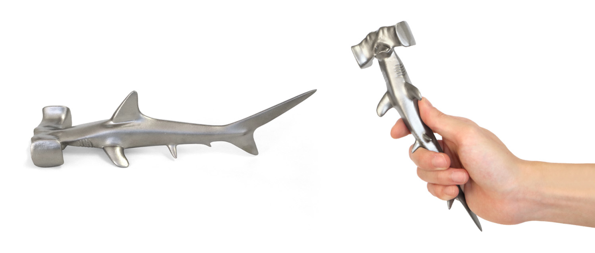 「鎚頭鯊鐵鎚」是把鎚頭鯊的頭直接金屬化,鑄造成真的可以敲釘子的鐵鎚。官方坦言,好不好用完全不是重點,但它確實能把釘子敲進去。重量約 450 公克。