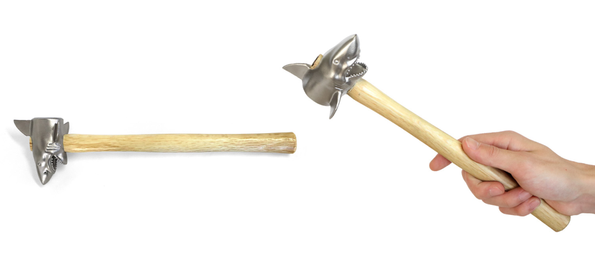 另一款「鯊魚頭鐵鎚」則是以大白鯊的頭部為造型,連牙齒都用鑄造方式忠實還原。搭配木製握柄,拿起來比較順手,頸部側邊的平面設計也很適合敲釘子使用,重量同樣約 450 公克。