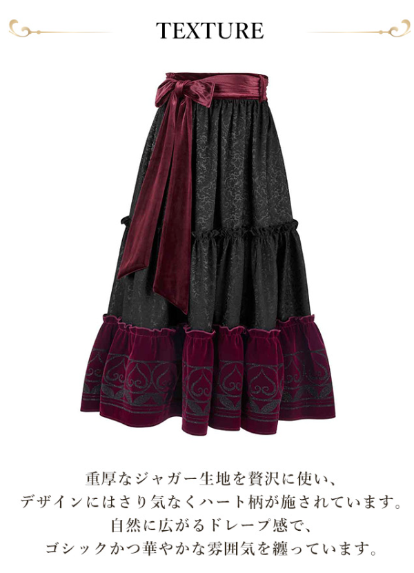 材質上,大量使用厚實的提花布料,設計上低調地加入了愛心圖樣點綴。整體自然垂墜、線條柔順,營造出既哥德風又華麗的氛圍。