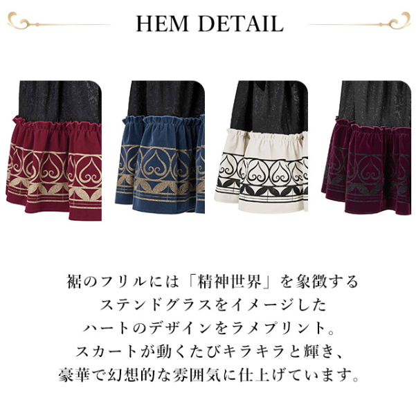 裙襬的荷葉邊上,以象徵「精神世界」的彩繪玻璃為靈感,搭配愛心圖樣做成燙金印花設計。走動時裙擺會閃閃發亮,整體營造出華麗又夢幻的氛圍。