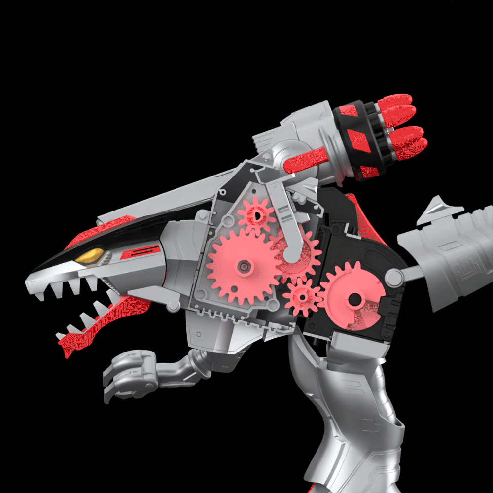 而整體使用的半自動變形機構更是大幅致敬 DX 玩具的設計,由於不像當年玩具那樣能靠電動機構完成聲控完全自動變形,因此身軀內採用了精密的齒輪連動機構,恐龍形態下旋轉肩、腕部後便會將身軀部分打直,變形為機器人形態!變形完成後,右腕武裝「左輪飛彈」能將一個個彈頭單獨拆卸,左腕武裝「暴龍飛拳」也具備再現射出狀態的分離機構。