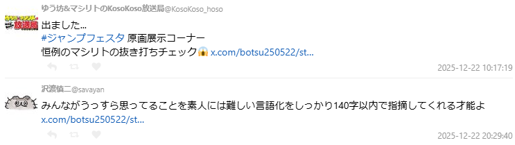 這番直言隨即在 X(前 Twitter)上引發大量討論。有參與Jump Festa的網友表示,這正是活動中「慣例」的鳥嶋式突襲檢查;也有漫畫創作者指出,鳥嶋能在短短幾句話中,把多數人「隱約覺得不對勁、卻說不出口的問題」精準點出,正是其身為資深編輯的實力。