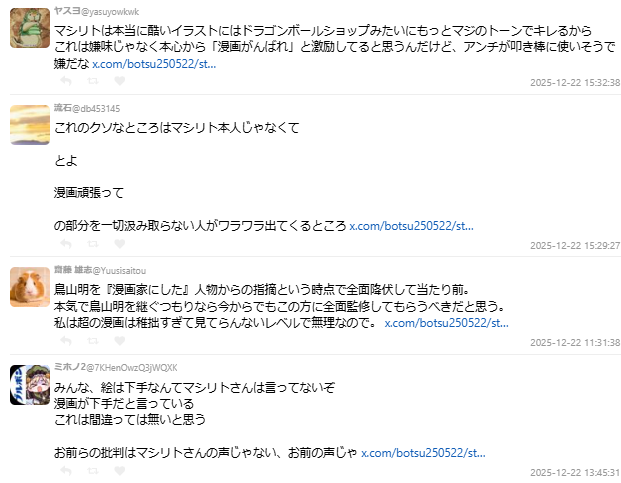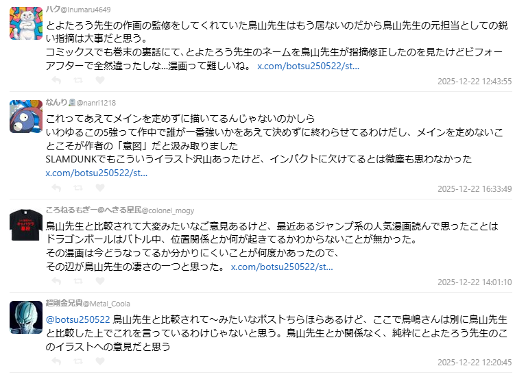 但也有不少人持相反看法,指出鳥嶋的評論並非單純拿豐太郎與鳥山明比較,而是基於「漫畫表現力」本身提出的專業意見。更有網友認為,正因為鳥山明已經離世,能以這種立場對豐太郎提出建議的人,如今已所剩無幾。
