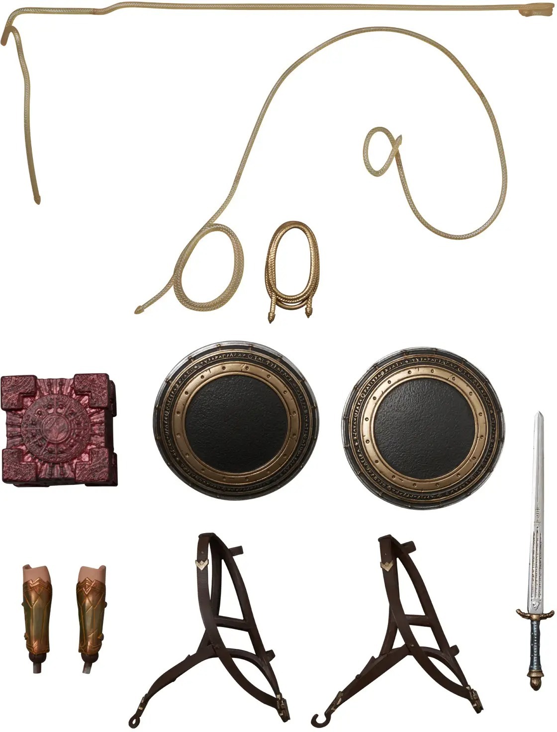 雕刻細膩的還原電影中神利女超人的戰服,胸甲與靴子上的刮痕、腰帶的刻紋等細節都被精緻再現,裙擺部分則是看起來採用了軟塑膠材質降低對於可動度的影響!配件部分收錄有三顆替換頭雕、盾牌、彩透材質打造的真言套索、長劍以及母盒零件,並附有武器的背帶可以同時幾乎讓所有武器上身,可以配合靈活可動再現各種動態!