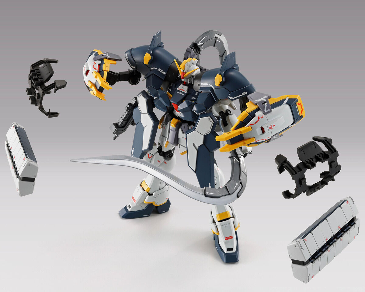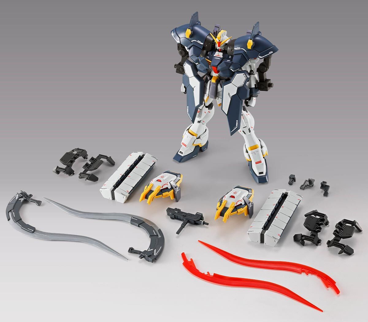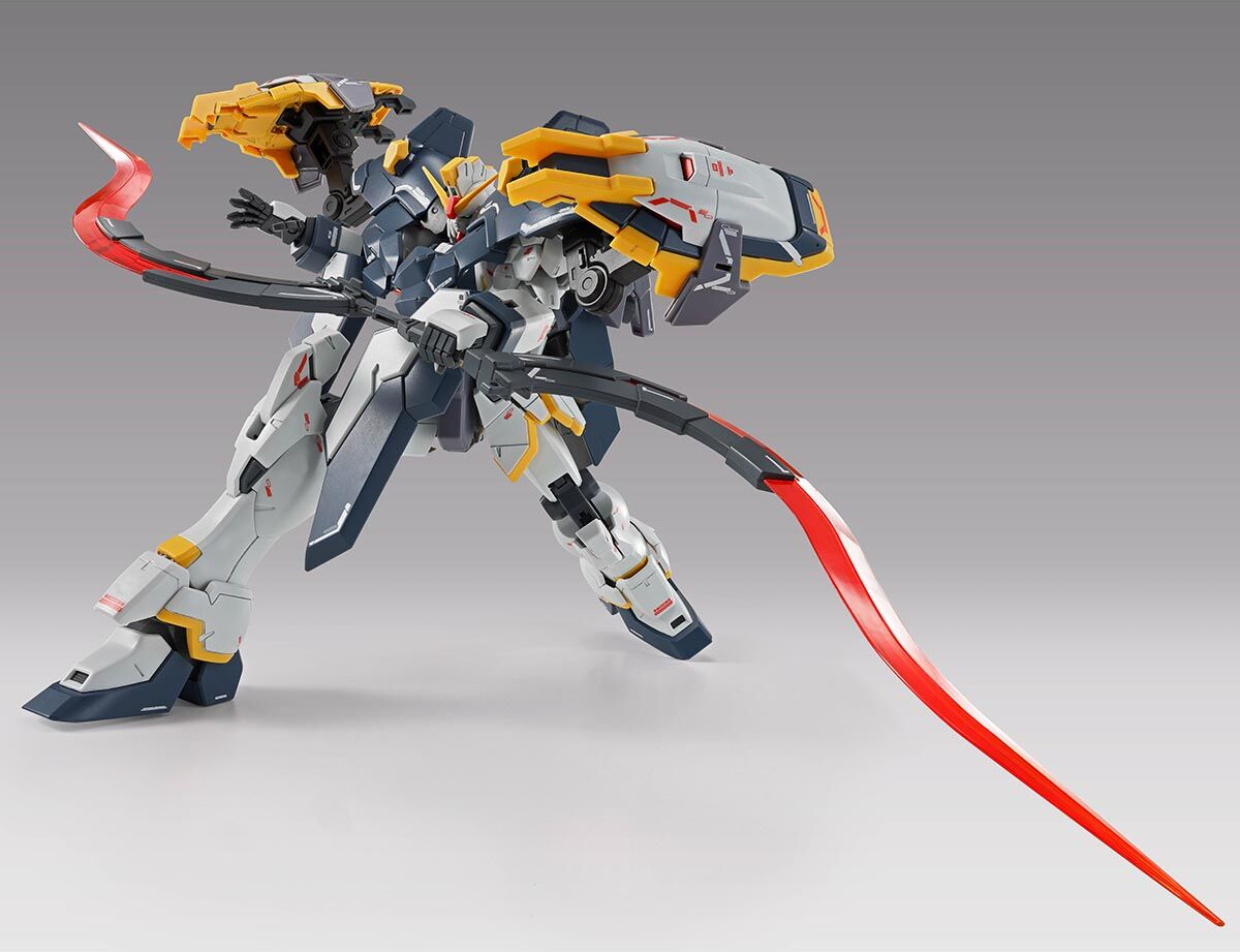 「MG 1/100 沙漠鋼彈EW 犰狳蜥裝備」基於過去推出的犰狳裝備套件修改而來,沿用沙漠鋼彈EW本體與各部大型增設裝甲,具備出色的分色分件設計與可動機構,附有能懸掛背部兩側的帥氣主武器「電熱彎刀」、「光束機槍」與設計師 Katoki Hajime 設計的原創機身標誌水轉印貼紙。