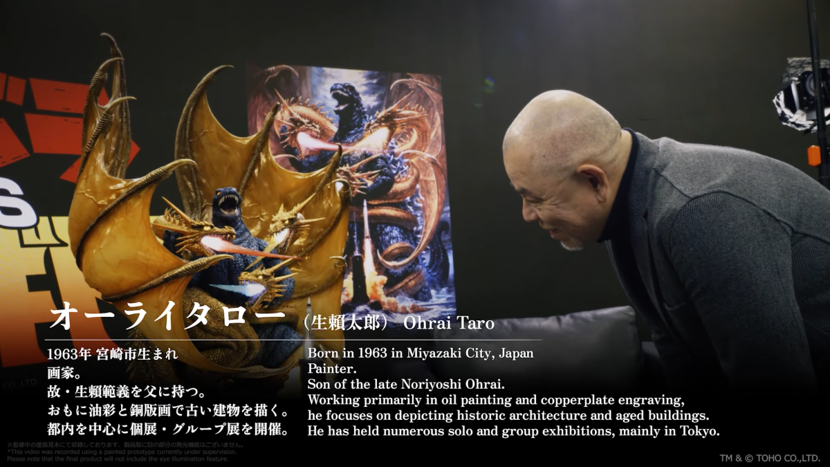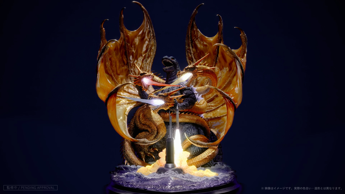 「LEGACY ART 哥吉拉VS王者基多拉 無比例雕像」採用全高約 82 公分、寬 61 公分的魄力尺寸將這幅經典海報立體化,忠實再現生賴範義大師所運用的色彩和筆觸痕跡。製作出王者基多拉緊緊纏繞哥吉拉的身軀、極具躍動感的魄力巨大雙翼,哥吉拉也以充滿力量的雙臂制服其中兩顆頭,同時還有畫面前方核子潛艇浮出海面、發射導彈的模樣。