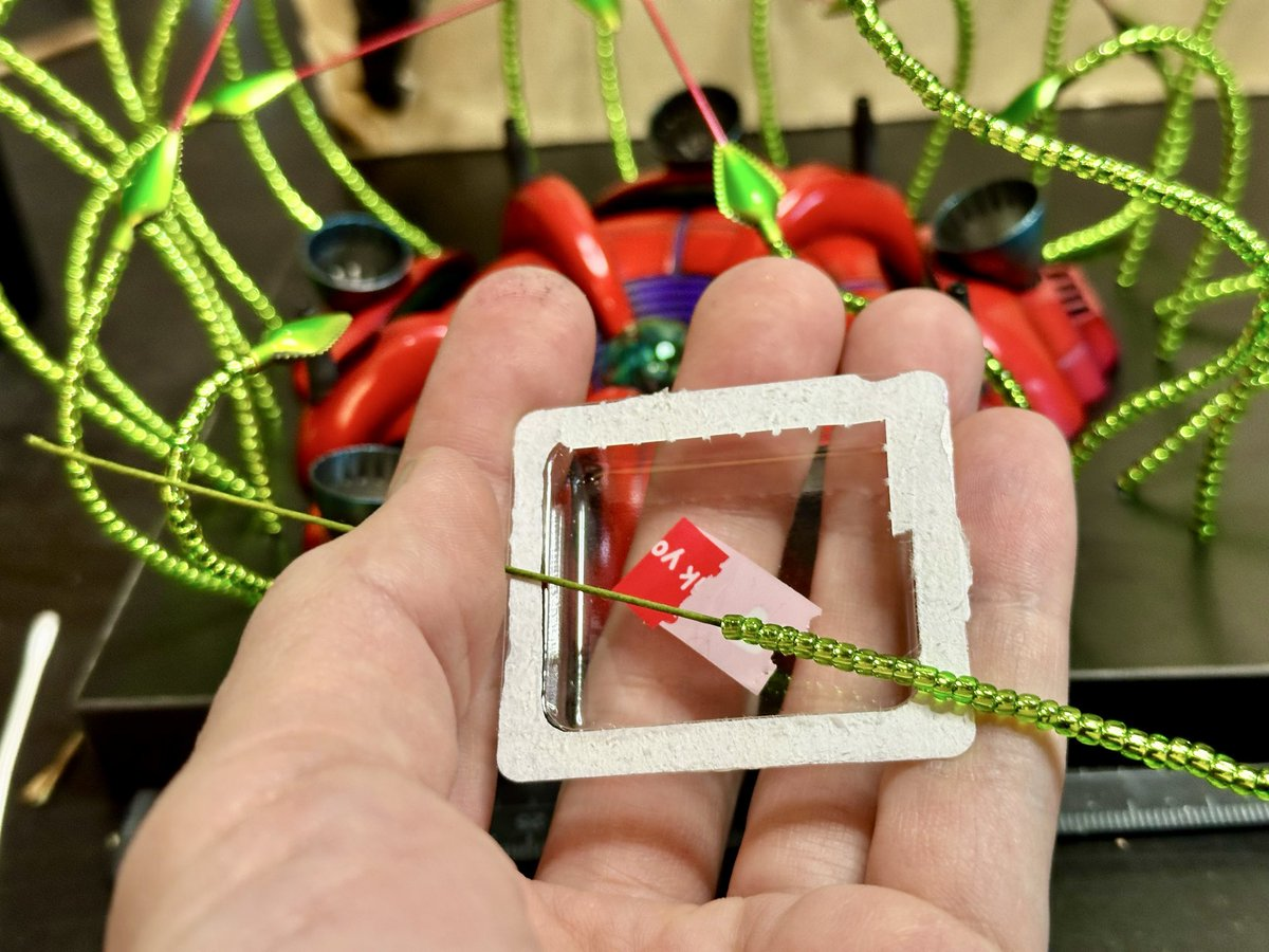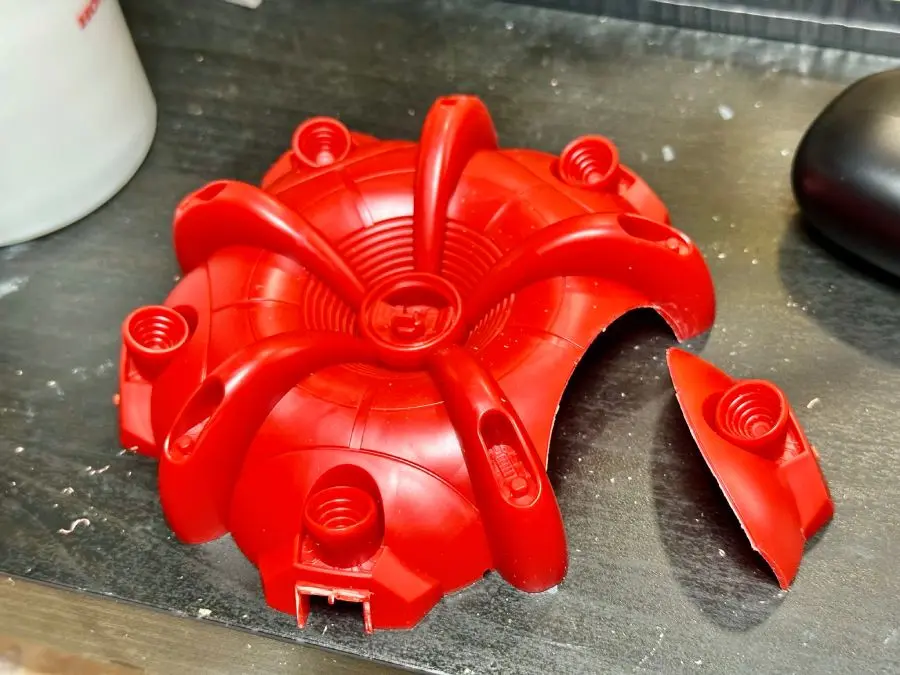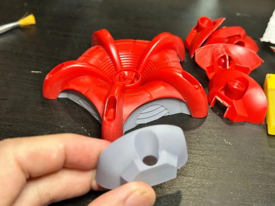 而作為底座的拉弗雷西亞,原本是MG鋼彈F91附屬的展示台零件,但因為是一體成型、細節略顯粗糙,他乾脆把花瓣狀的邊緣整個切掉,改用 3D 列印自行重製。之後還進一步進行:
