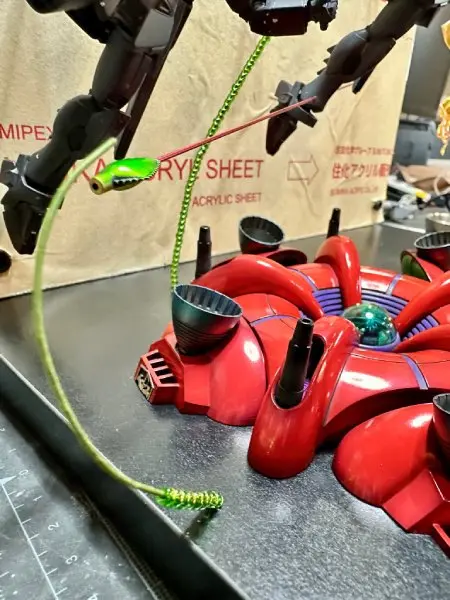 庄松屋製作的場景模型正是定格了那一瞬間——F91 在拉弗雷西亞的觸手間高速穿梭,身後連成一串的,是被剝離下來、宛如殘像般殘留在空間中的裝甲碎片。
