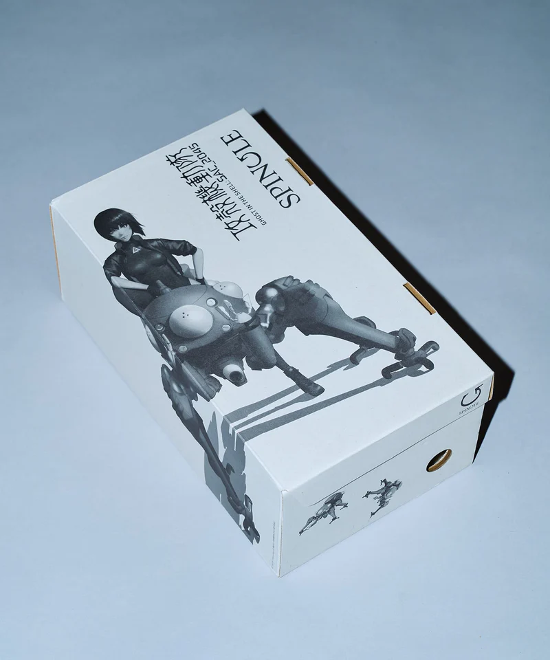 將SPINGLE人氣中筒鞋款「SP-442」的設計成2045年版本,與草薙素子的服裝形象結合而成。鞋面使用裁切時較不浪費材料的針織素材,外底則採用加入植物纖維「纖維素奈米纖維(CNF)」的自家製耐磨大底「RUBEAR CNF Sole」。同時也延續 SPINGLE 招牌的硫化製法,以熱與壓力將鞋面與鞋底牢牢貼合,兼顧耐用度與穿著感。